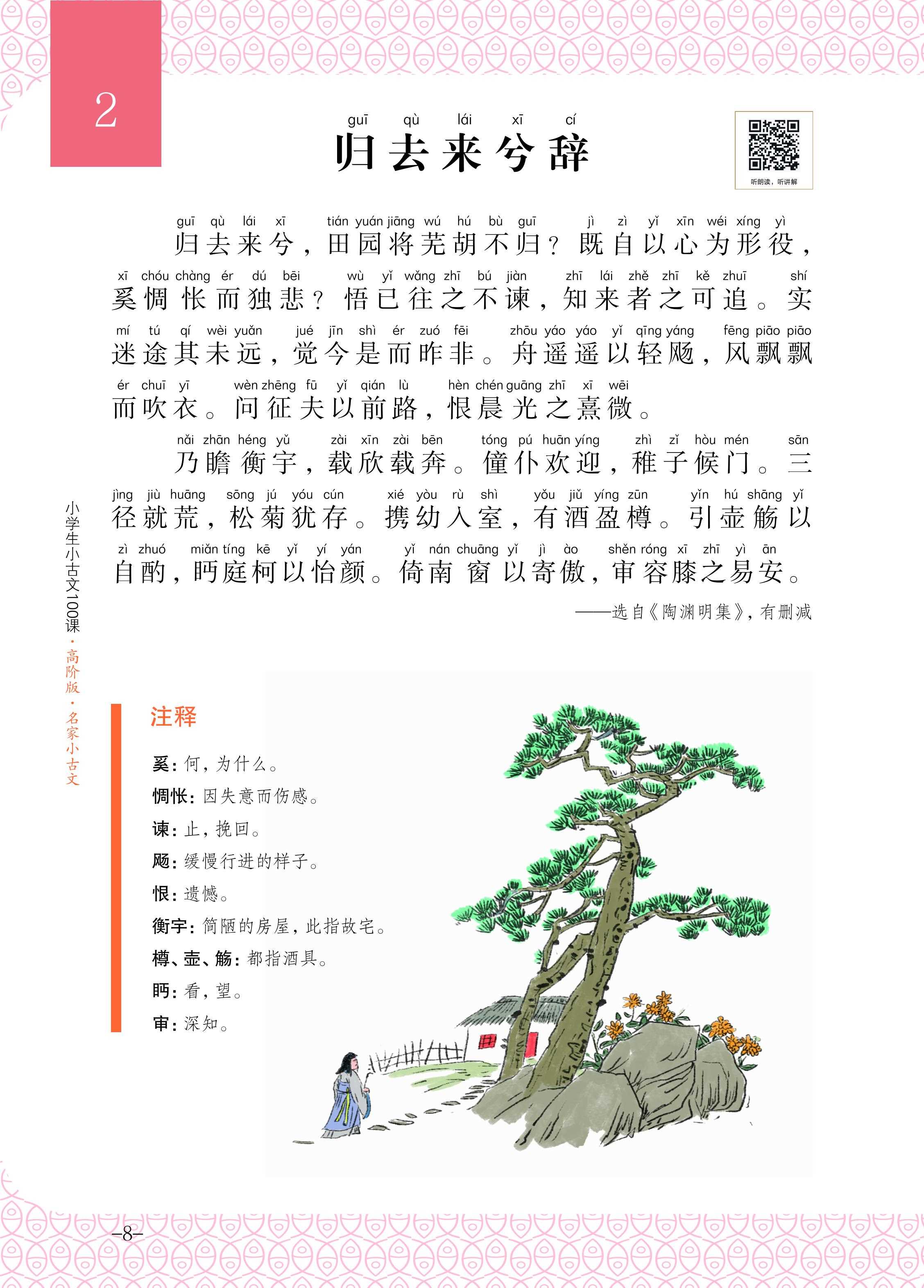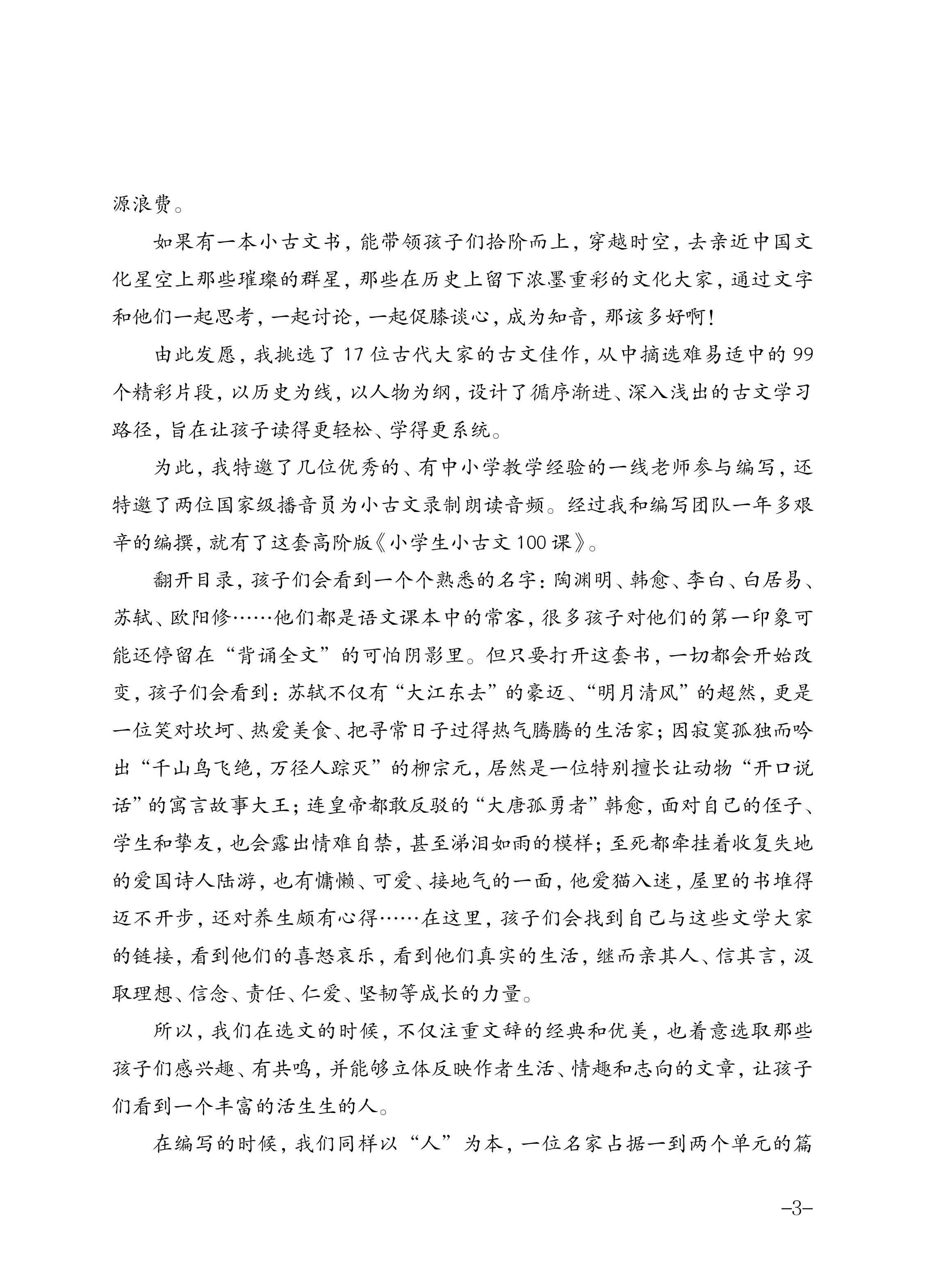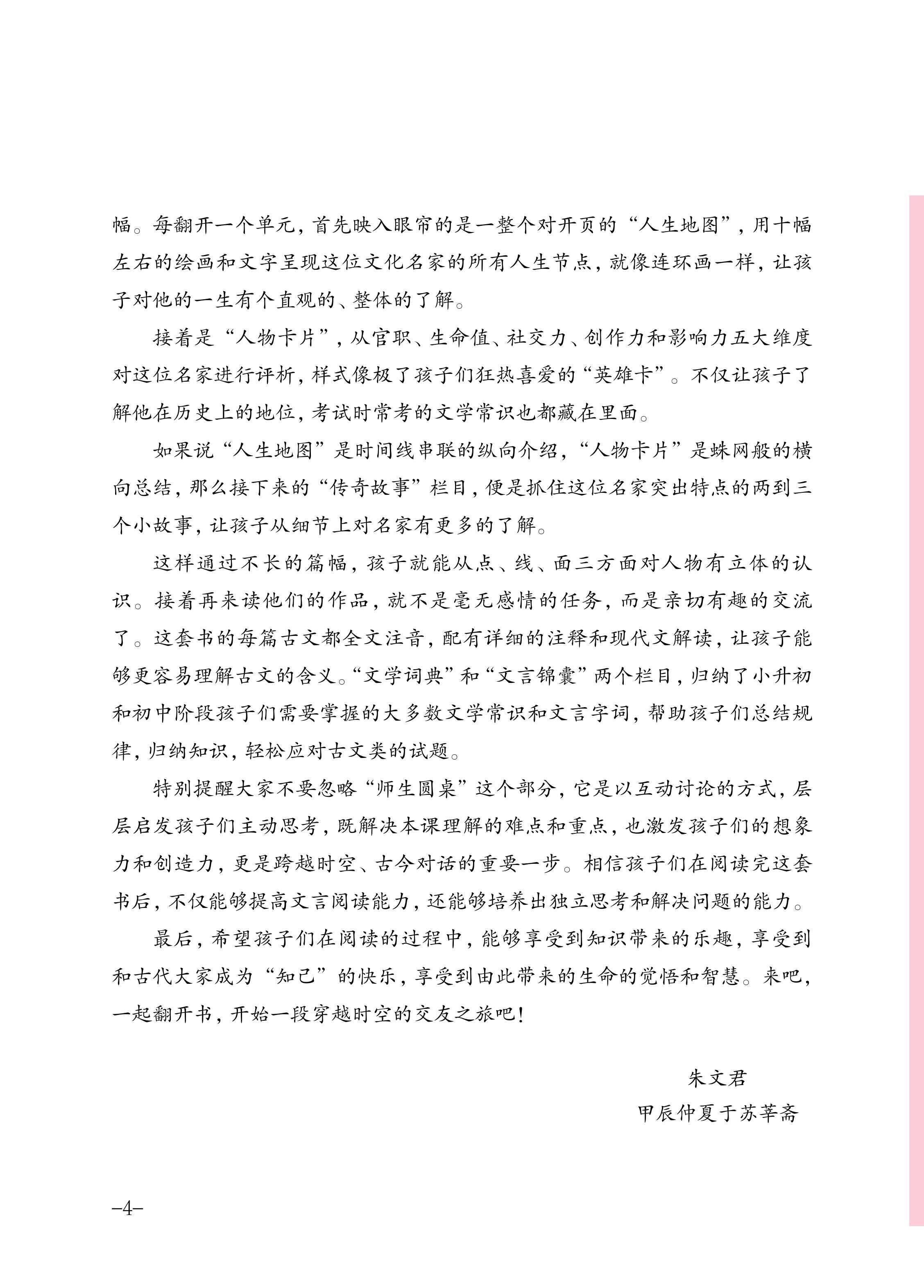 本书是《小学生小古文100课》的高阶版,在内容和形式上都进行了创新,更符合小学生高年段的古文学习特点。◇;人生地图,时间线串联的纵向介绍,呈现文化大家的人生重要节点。◇;人物卡片,从官职、生命值、社交力、创作力和影响力五大维度,对古文大家进行蛛网般的横向总结。◇;传奇故事,古文大家的两到三个故事,感受人物特点。◇;文学词典和;文言锦囊,帮助轻松应对古文试题。◇;师生圆桌,以师生对话形式点拨本课重难点,把握名篇精髓,启发读写方法。◇ 附赠朗读音频、参考答案,用准确的停连、美好的声音启发孩子理解、培养文言语感。