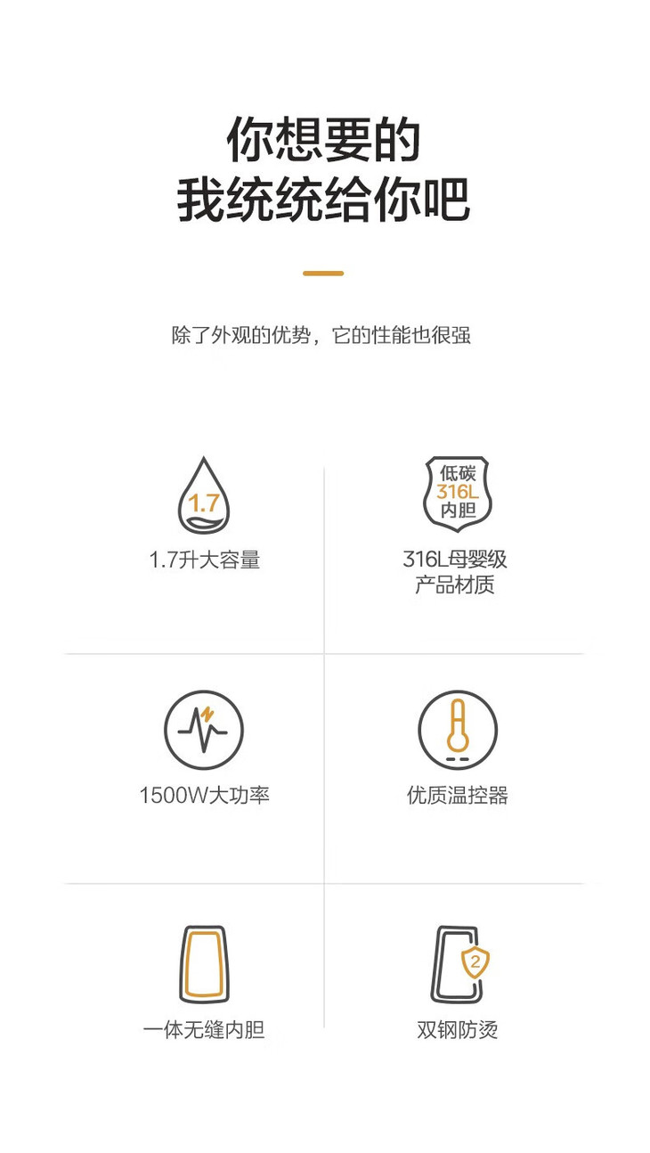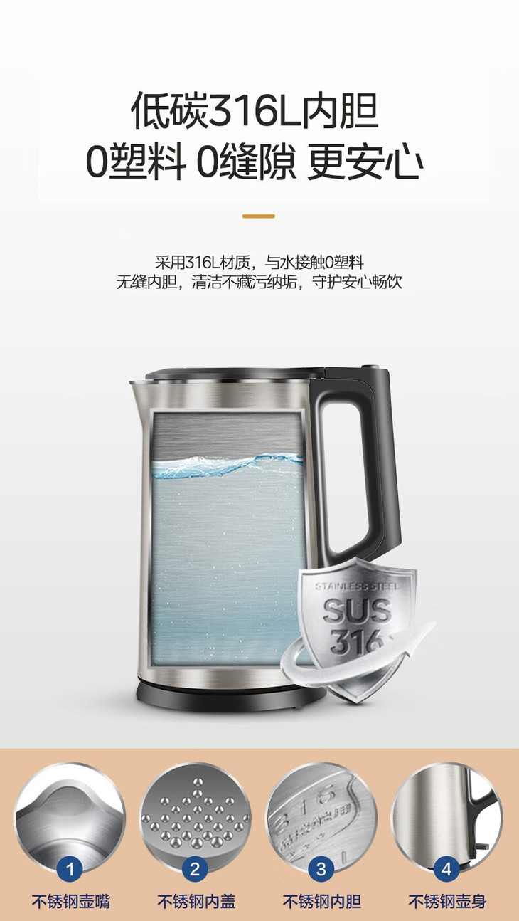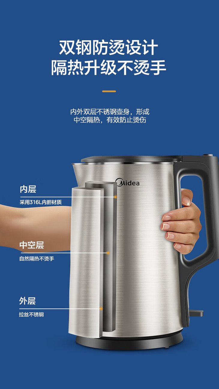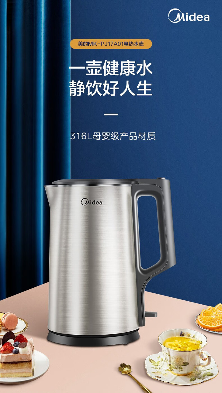 美的(Midea) 电热水壶家用1.7L烧水壶双钢防烫防干烧热水壶316不锈钢电水壶PJ17A01