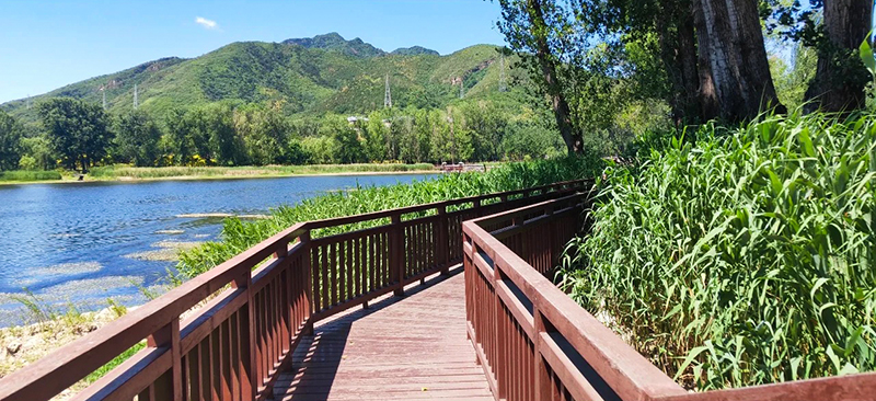 栈道最大特色在于其绝佳的观景视角,登高远望,雁栖湖的湖光山色尽收眼底,尤其日出日落时分景色最为壮美。沿途植被茂密,四季景观各异:春季山花烂漫,夏季绿树成荫,秋季层林尽染,冬季雪映湖山。步道设施完善,设有休息区和指示牌,是京郊集观光、摄影、健身于一体的热门生态步道。