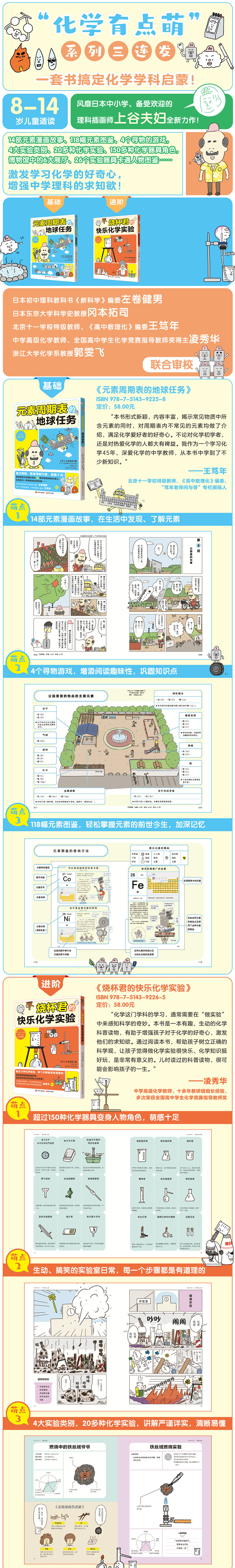 Ø 日本备受欢迎的理科插画师上谷夫妇全新力作“化学有点萌”系列之《元素周期表的地球任务》《烧杯君的快乐化学实验》