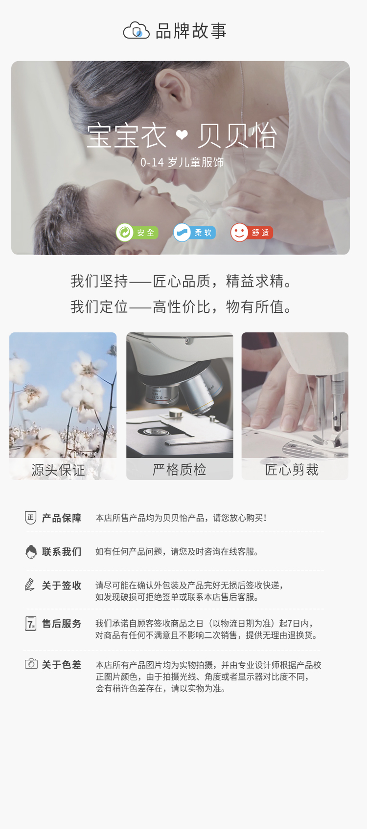 - 贝贝怡专注0-6岁婴幼儿服饰,坚持安全、柔软、舒适的产品理念,为千万中国家庭提供超高品质、安全可靠的婴幼儿服饰产品,妈妈放心,宝宝开心!