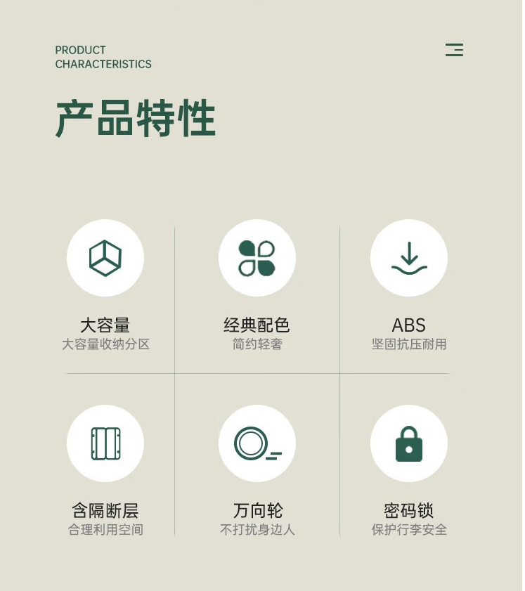 大容量 收纳分区 经典配色 简约轻奢 万向轮 密码锁