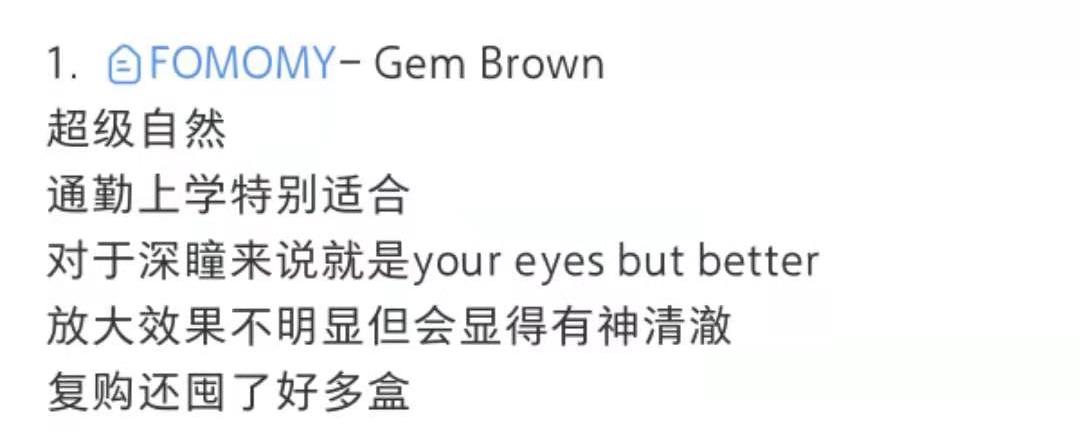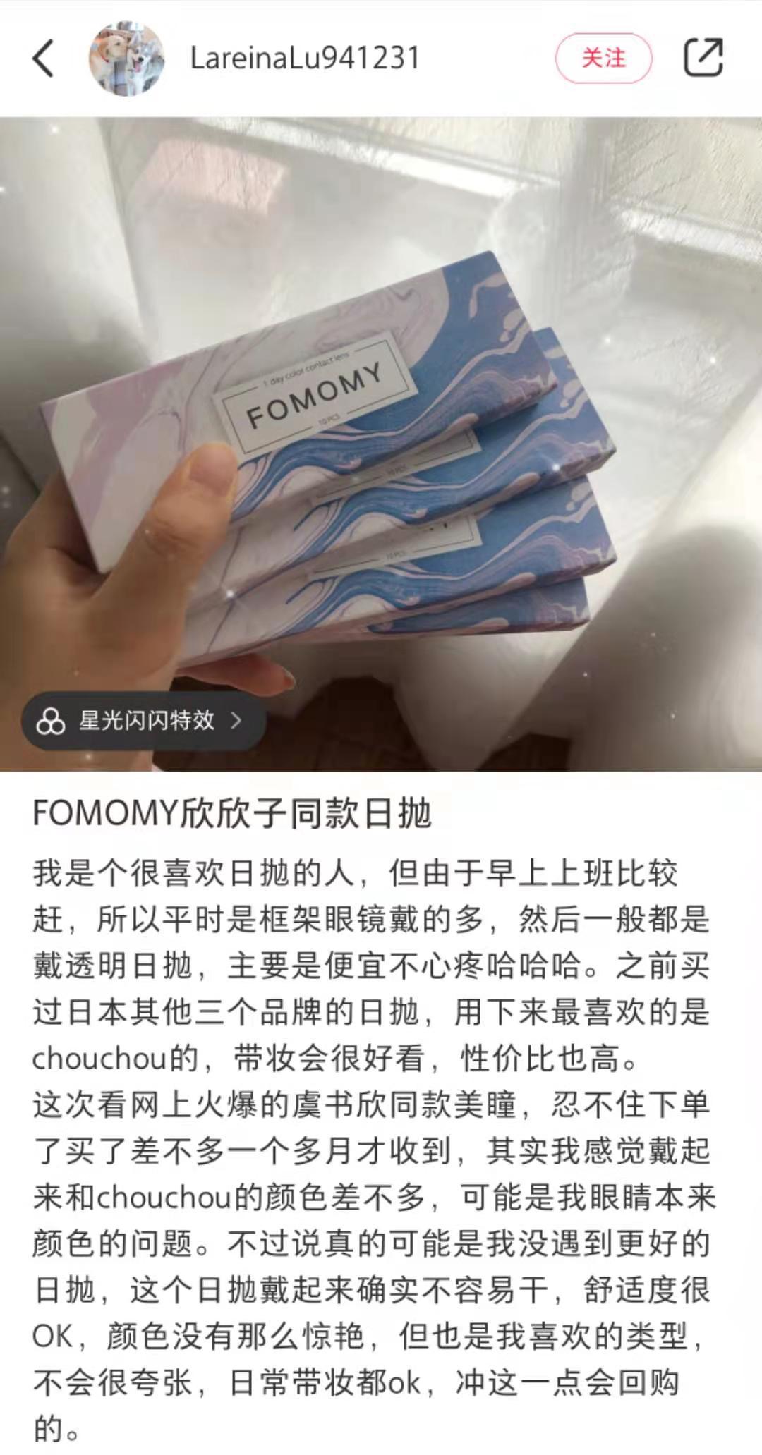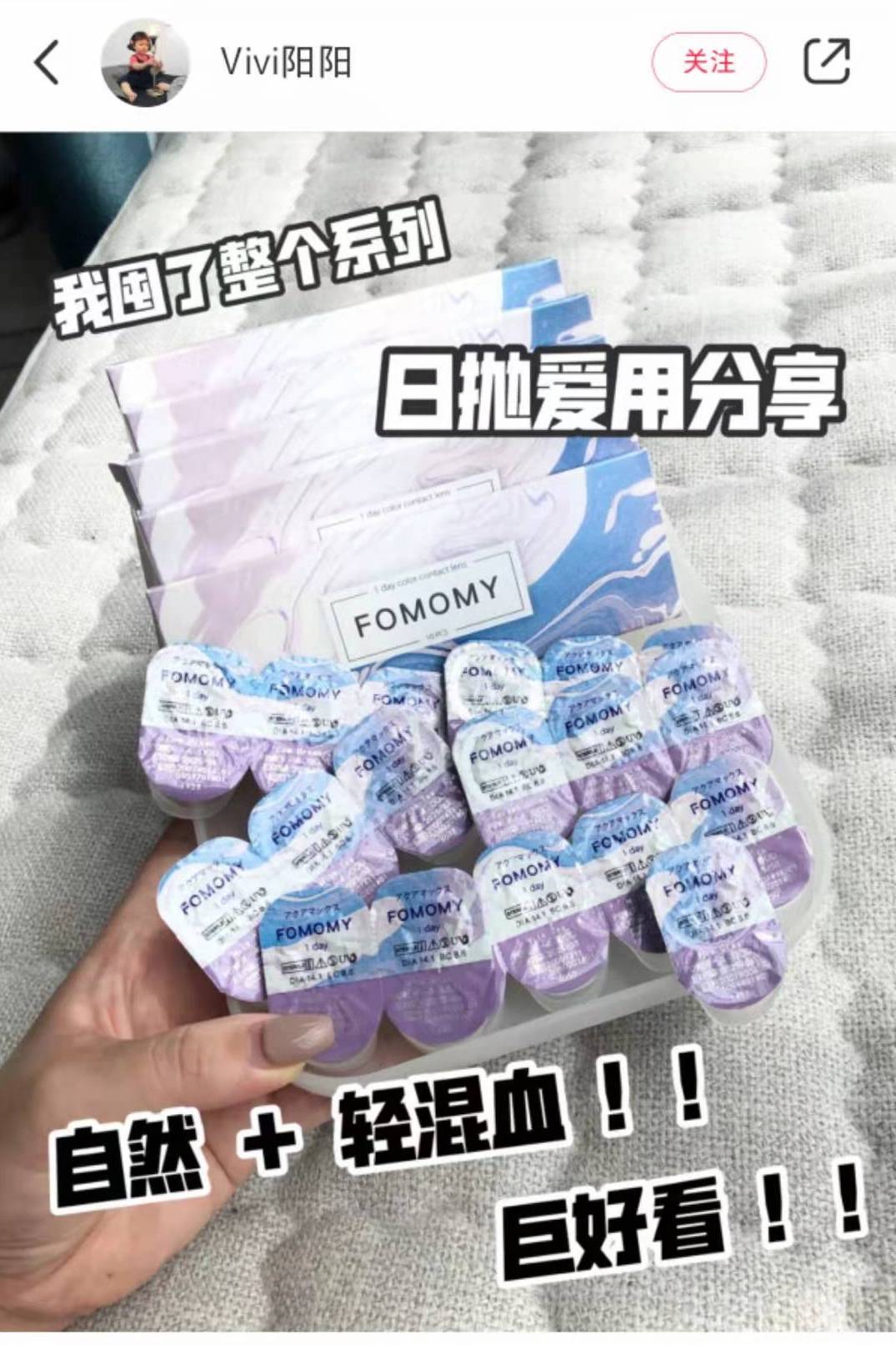 作为一个戴隐形眼镜超20年的1200度大近视,我还是很有发言权的。之前上过的几款年抛美瞳也算是年抛里的佼佼者了,但是要说舒适度,那确实日抛坠舒服,因为日抛通常在含水量上会比年抛高很多,镜片的厚度却比年抛薄,而且每天扔,不会有泪蛋白的烦恼!但价格也会高一些,普通透明的一片也要5-15元,美瞳则基本要10-20元。这次我上的是日本的FOMOMY,2020年在ins上火到TOP3,更因为虞书欣在社交APP上自称囤货100盒而全网断货……所以,真的,推荐!