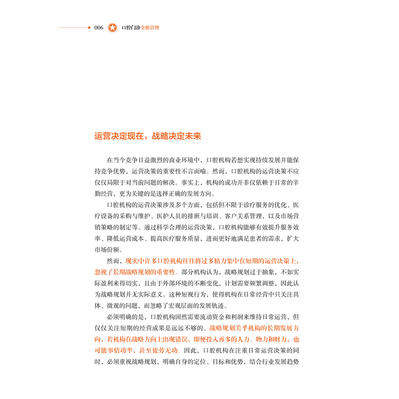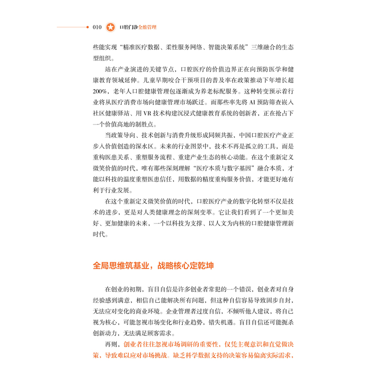 第一章战略规划篇//005运营决定现在,战略决定未来//006传统模式触顶,数字生态破局//009全局思维筑基业,战略核心定乾坤//010口腔全局思考,匠心经营升维//013愿景深度思考,全维落地执行//015左手管理组织,右手经营业务//017层级明则业务清,定位清则发展赢//020