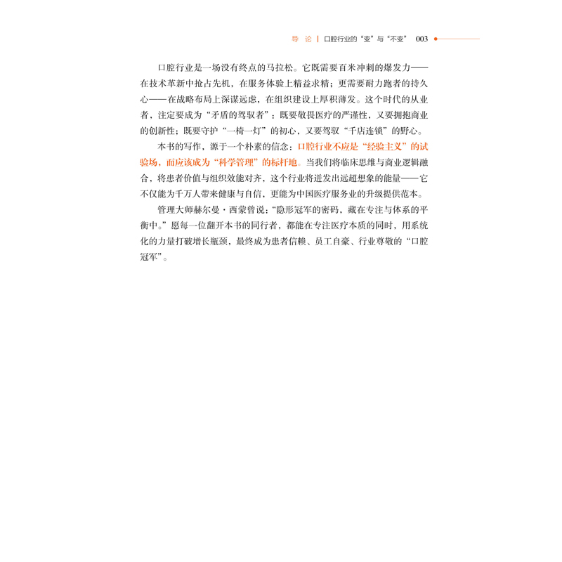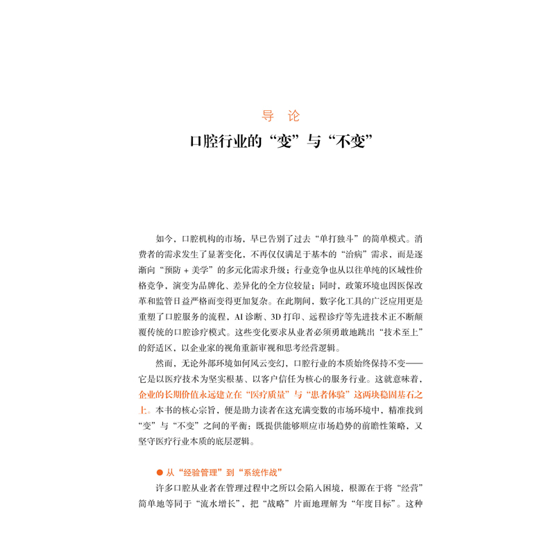 如今,口腔机构的市场,早已告别了过去;单打独斗的简单模式。消费者的需求发生了显著变化,不再仅仅满足于基本的;治病需求,而是逐渐向;预防 十 美学的多元化需求升级;行业竞争也从以往单纯的区域性价格竞争,演变为品牌化、差异化的全方位较量;同时,政策环境也因医保改革和监管日益严格而变得更加复杂。在此期间,数字化工具的广泛应用更是重塑了口腔服务的流程,AI诊断、3D打印、远程诊疗等先进技术正不断颠覆传统的口腔诊疗模式。这些变化要求从业者必须勇敢地跳出;技术至上的舒适区,以企业家的视角重新审视和思考经营逻辑。然而,无论外部环境如何风云变幻,口腔行业的本质始终保持不变它是以医疗技术为坚实根基、以客户信任为核心的服务行业。这就意味着,本书的核心宗旨,便是助力读者在这充满变数的市场环境中,精准找到;变与;不变之间的平衡:既提供能够顺应市场趋势的前瞻性策略,又坚守医疗行业本质的底层逻辑。