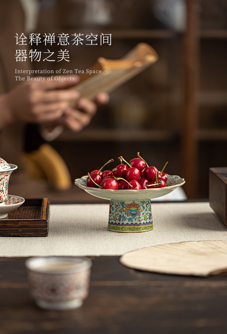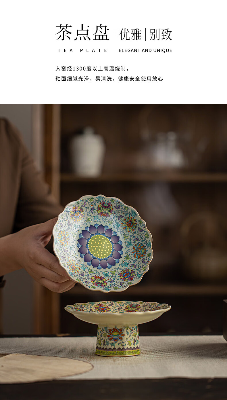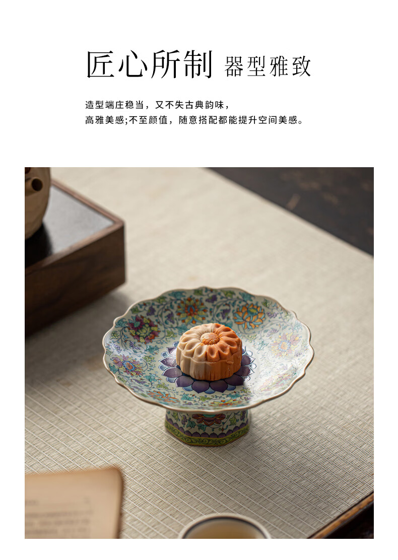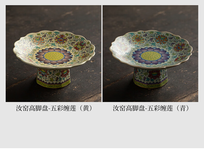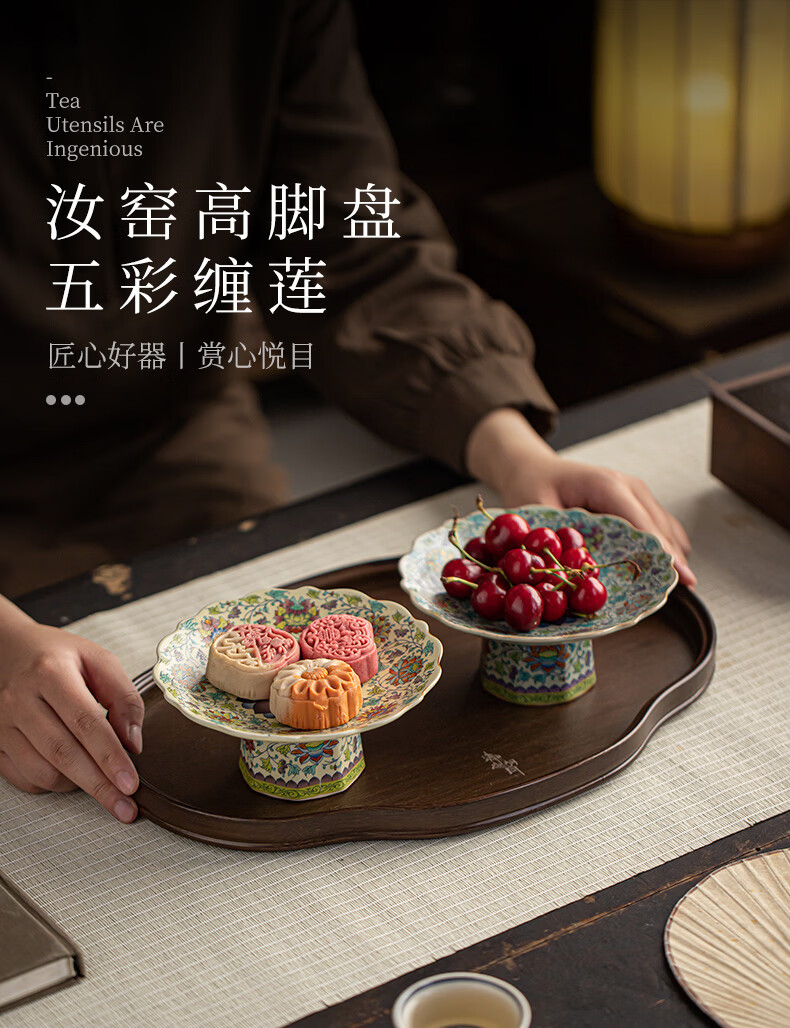【汝窑高脚盘-五彩缠莲】中式复古精致陶瓷高脚茶点盘家用零食干果盘高足客厅茶几摆台果盘