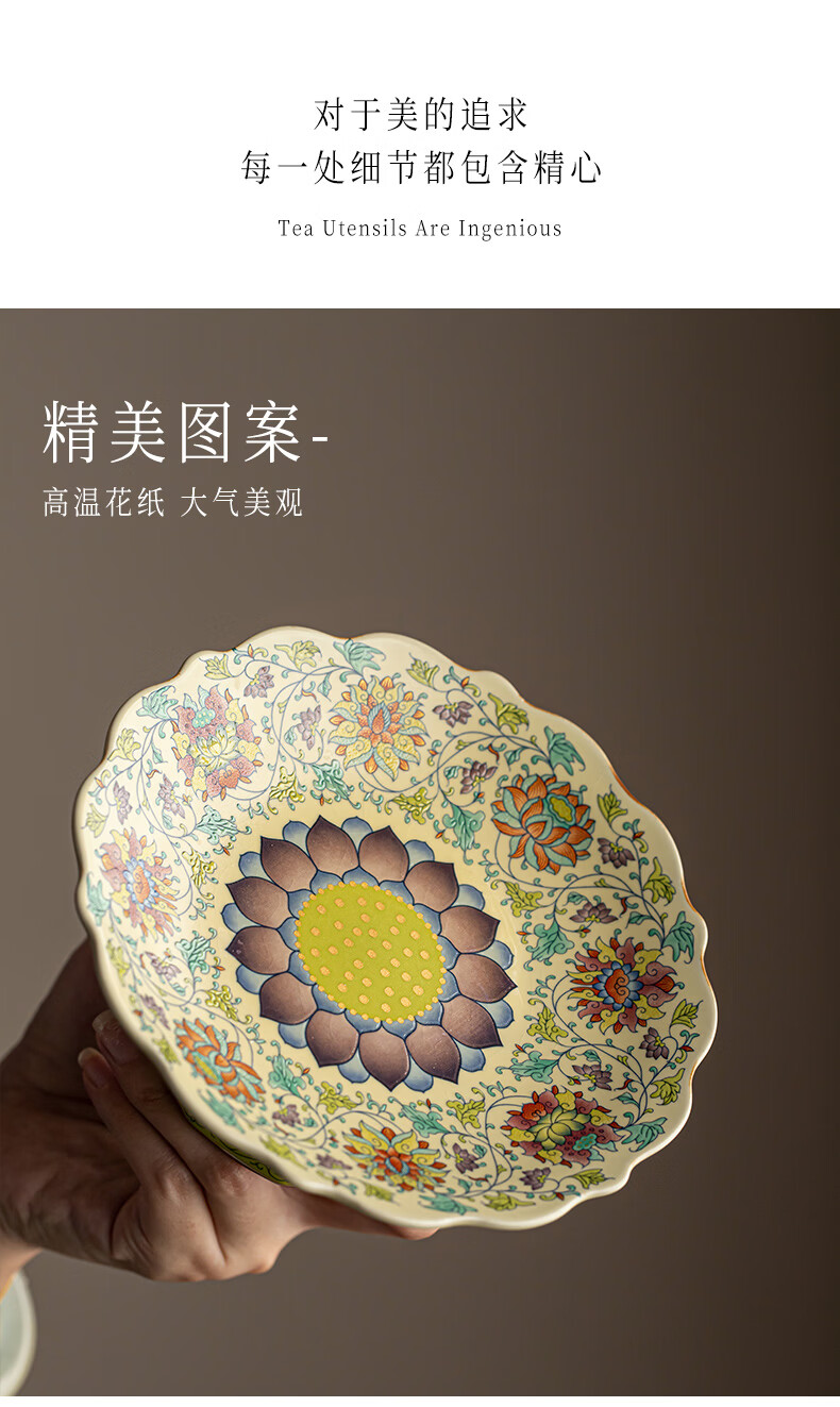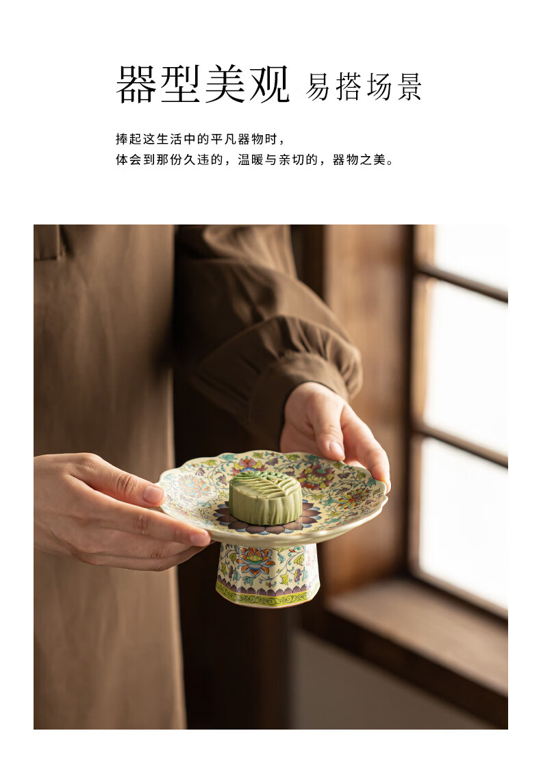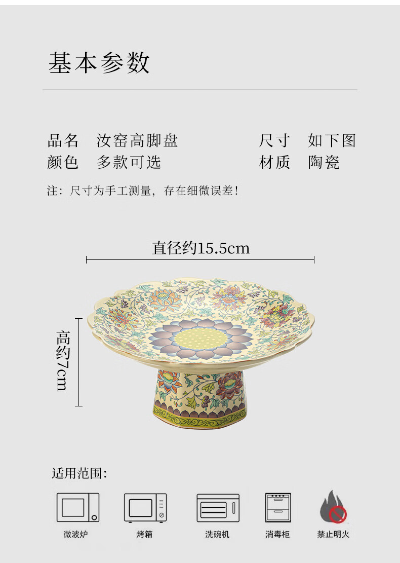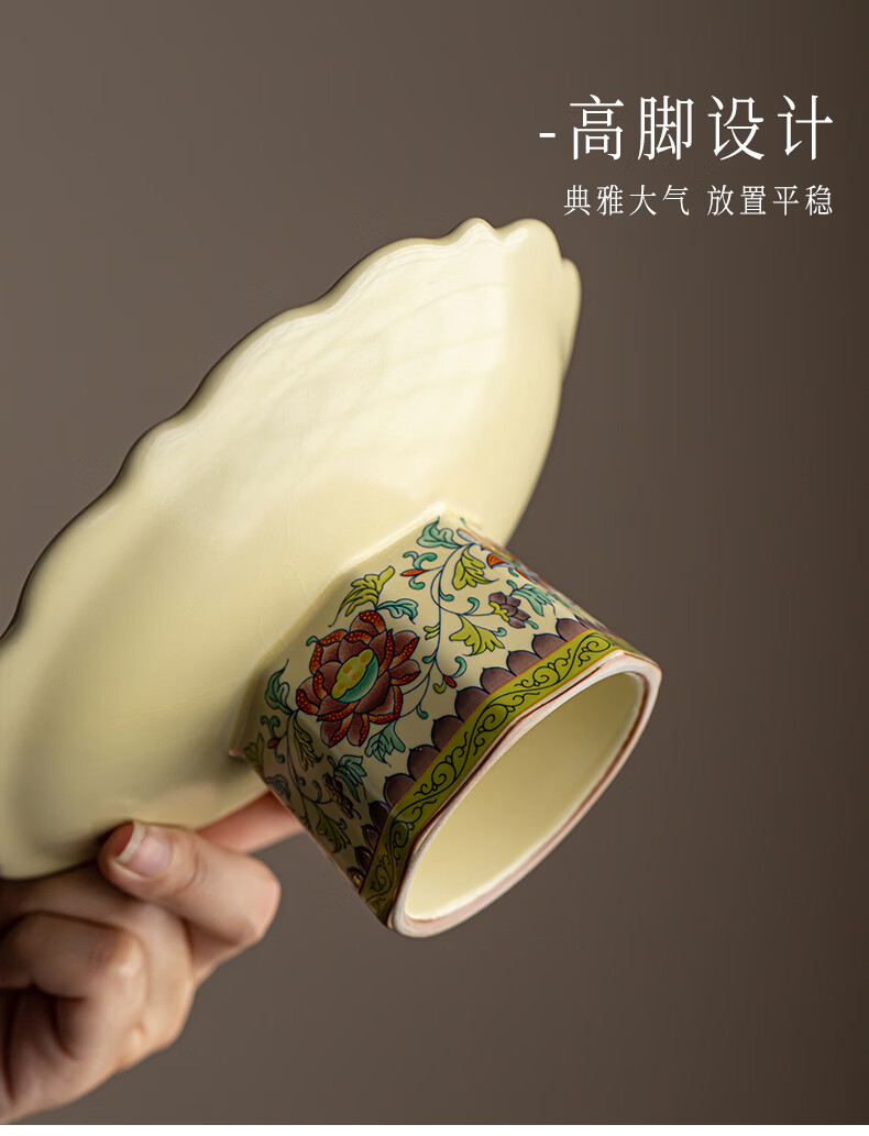 【汝窑高脚盘-五彩缠莲】中式复古精致陶瓷高脚茶点盘家用零食干果盘高足客厅茶几摆台果盘