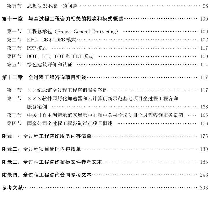 序 前言 第1章 我国工程管理模式演变历程 第2章 传统工程项目管理模式的弊端和不足 第3章 我国工程咨询行业发展和政策法规概述 第4章 全过程工程咨询的优势 第5章 全过程工程咨询之项目管理 第6章 全过程工程咨询组织模式 第7章 全过程工程咨询之招标采购 第8章 全过程工程咨询服务总包招标与选择模式 第9章 全过程工程咨询之工程监理 第10章 全过程工程咨询面临的重点难点问题 第11章 与全过程工程咨询相关的概念和模式概述 第12章 全过程工程咨询项目实践和案例分析 附件一:全过程工程咨询服务总包招标文件(样本) 附件二:全过程工程咨询服务总包合同文本(样本)