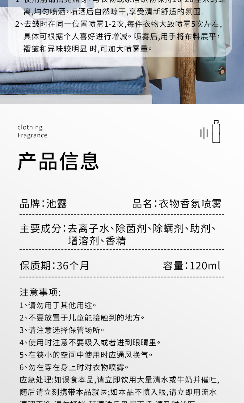 【29.9元任选2件】池露衣物香氛喷雾清新除异味 120ml/瓶