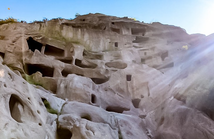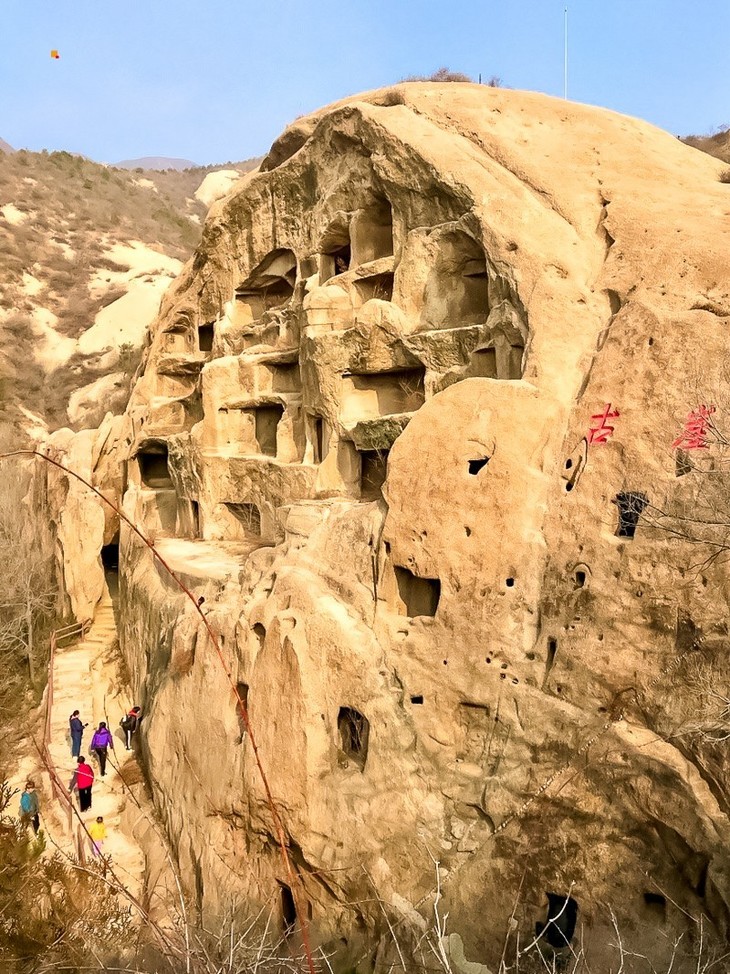 这里是古代人在陡峭的山崖上凿建的居所。在峡谷中一条不到10米宽的山沟两侧,距离谷底近10万平方米的陡峭花岗岩石壁上,遍布着人工凿刻的大小不同的石室。