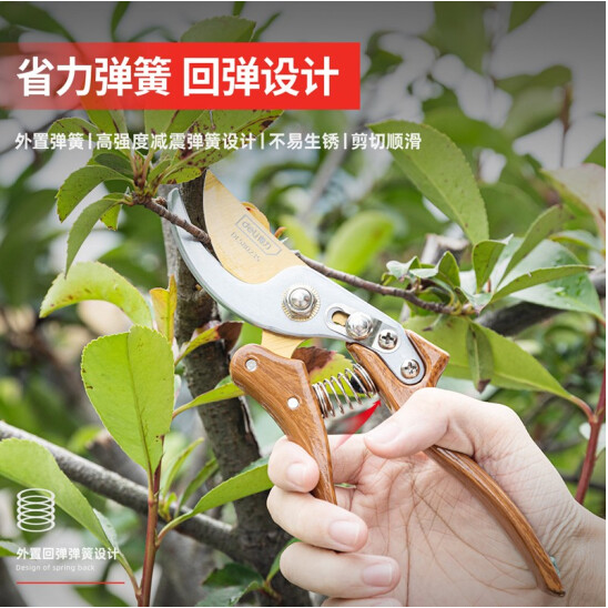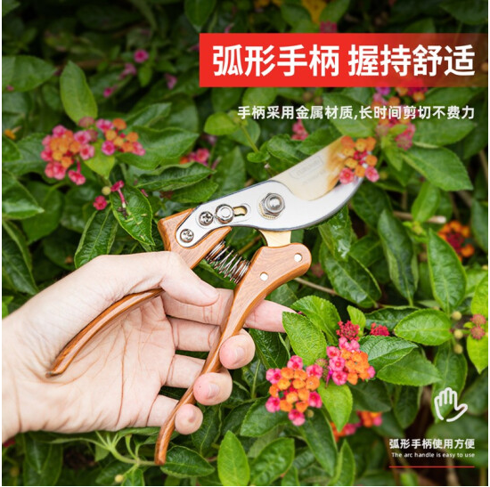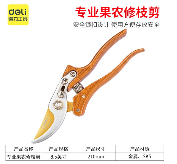 得力DL580235专业果农修枝剪木纹金属手柄8"SK5镀钛刀头(红)