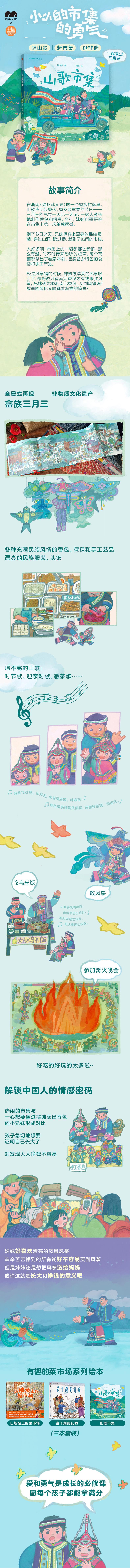 这是一本原创图画书,适合3~6岁的儿童阅读。在浙南(温州泰顺)的一个畲族村落里,山歌声此起彼伏,畲乡最重要的节日——三月三的气氛一天比一天浓。一家人紧张地制作香包和粿粿。今年,妹妹和哥哥将在市集上第一次单独摆摊。到了节日这天,兄妹俩穿上漂亮的民族服装,穿过山洞,跨过桥,就到了热闹的市集。人好多啊!市集上的一切都那么新鲜,那么有趣,时不时传来动听的歌声。每个商铺都拿出了看家本领,售卖畲乡特色的食物和手工产品。他们经过风筝铺的时候,妹妹被漂亮的风筝吸引了,哥哥说只有卖完香包才有钱来买风筝。兄妹俩能顺利卖完香包、买到风筝吗?故事的最后又暗藏着怎样的惊喜?这本讲述畲族三月三的趣味故事绘本,描绘孩子成长飞跃的一瞬间,带给孩子勇气和力量。