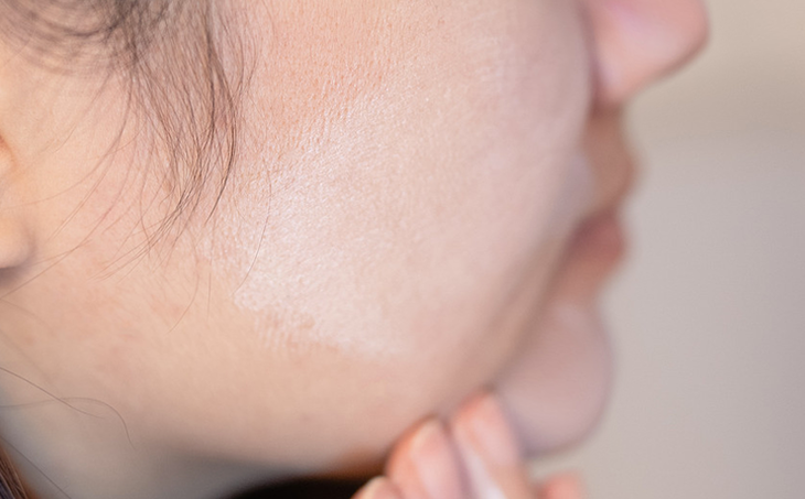 可以看我的脸部皮肤特写,有一种水光感,是那种能透出气色的粉白,连鼻周容易暗沉的地方都很自然。