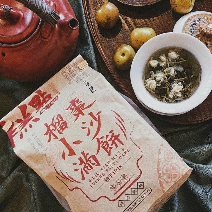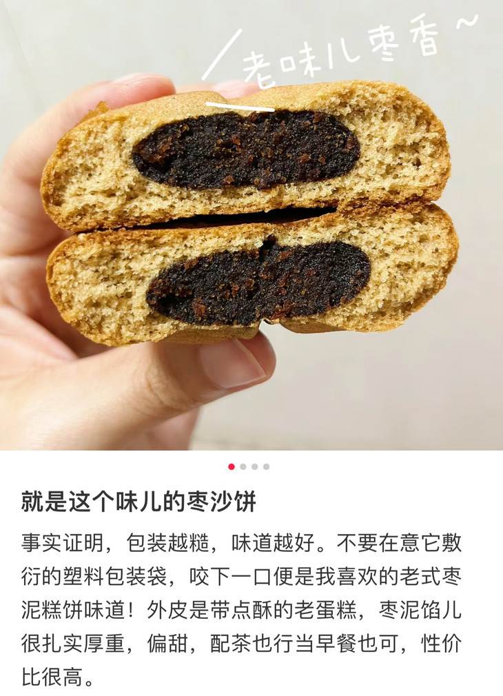 枣沙饼,一包约250g,是古朴的油纸加小包装,随手拆开一袋,顿时枣香四溢,甜香扑鼻而来,轻咬一口,满满的红枣馅细腻绵软,浓郁的枣香与蛋香交织缠绵,在口中化开,松软可口,和下午茶绝配!来上两枚枣沙饼,啜饮一杯喜爱的咖啡或茶水,那份满足与惬意瞬间填满心间,班味都淡了啊!