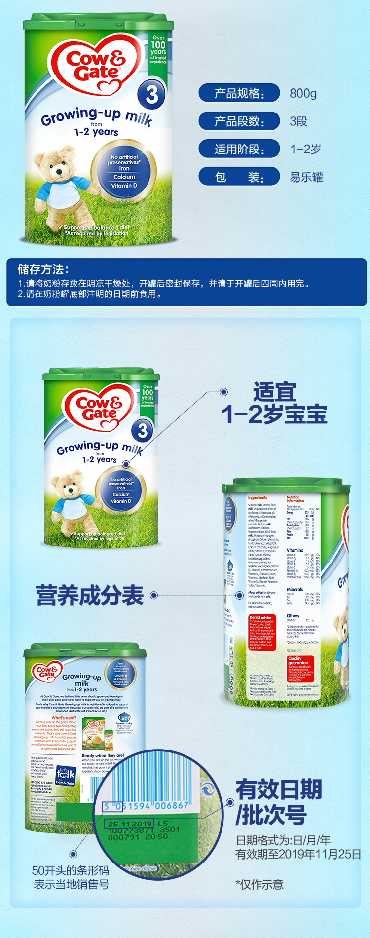 [保税区]英国 牛栏(Cow&Gate)婴幼儿奶粉 3段 800g
