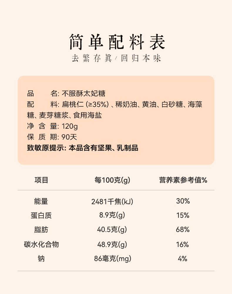 【产品配料】扁桃仁(≥35%)、稀奶油、黄油、白砂糖、海藻糖、麦芽糖浆、食用海盐