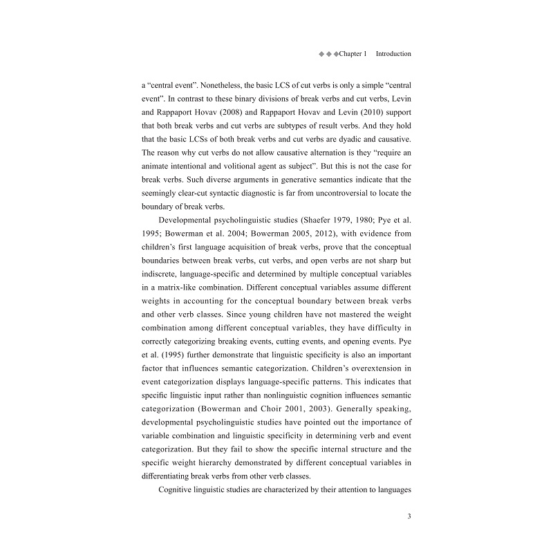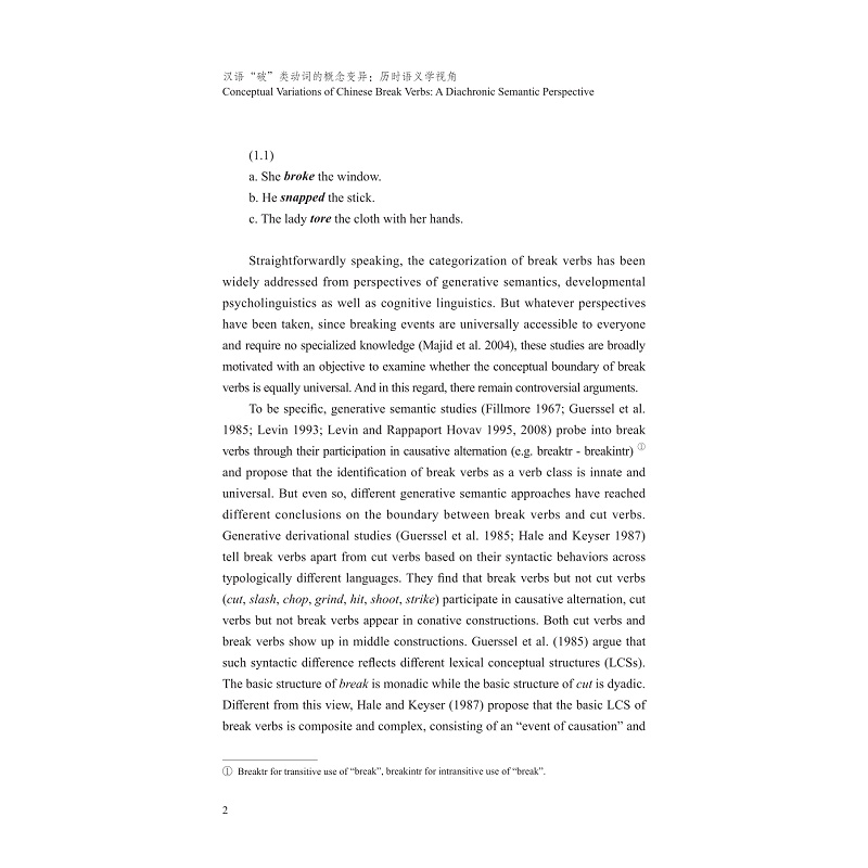 本书以历时原型语义学为研究框架,探索汉语“破”类动词的历时概念变异。历时原型语义学整合了原型理论、历时语义学以及词汇范畴化,基于原型概念结构从外延和内涵两个层面探讨词汇的历时概念变异。“破”类动词是表征分离状态变化事件,即物体由完整状态进入不完整状态的词汇范畴。既往研究基于不同理论视角从共时层面论述了“破”类动词的句法和概念结构,但是对该类动词的概念边界仍存在争议。基于历时原型语义学,本书将“破”类动词的概念结构研究由共时层面扩展到历时层面、由句法层面扩展到多维概念层面,旨在揭示这类词汇范畴的概念变异路径及深层认知机制。