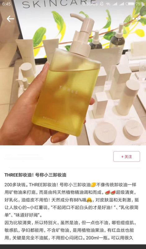 日本 THREE 纯植物平衡洁肤温和卸妆油 200ml㊙️以荷荷巴油,🍒堅果油跟玫瑰果油🔆等以最佳比例調配做底油,🌻再加上5種精油調配而成的,味道超級天然超級美好,能溫和迅速的溶化防水彩妝跟防水的防曬霜,✨清除毛孔中的油脂粒跟臟東西🌸,又可以很好的滋潤舒緩皮膚,讓肌膚在清潔後仍然保持滋潤柔滑的質感~~~~展延性無比好👍🏻,橙味很濃郁,非常好聞,非常放鬆,很有美容院做SPA的感覺~🍃