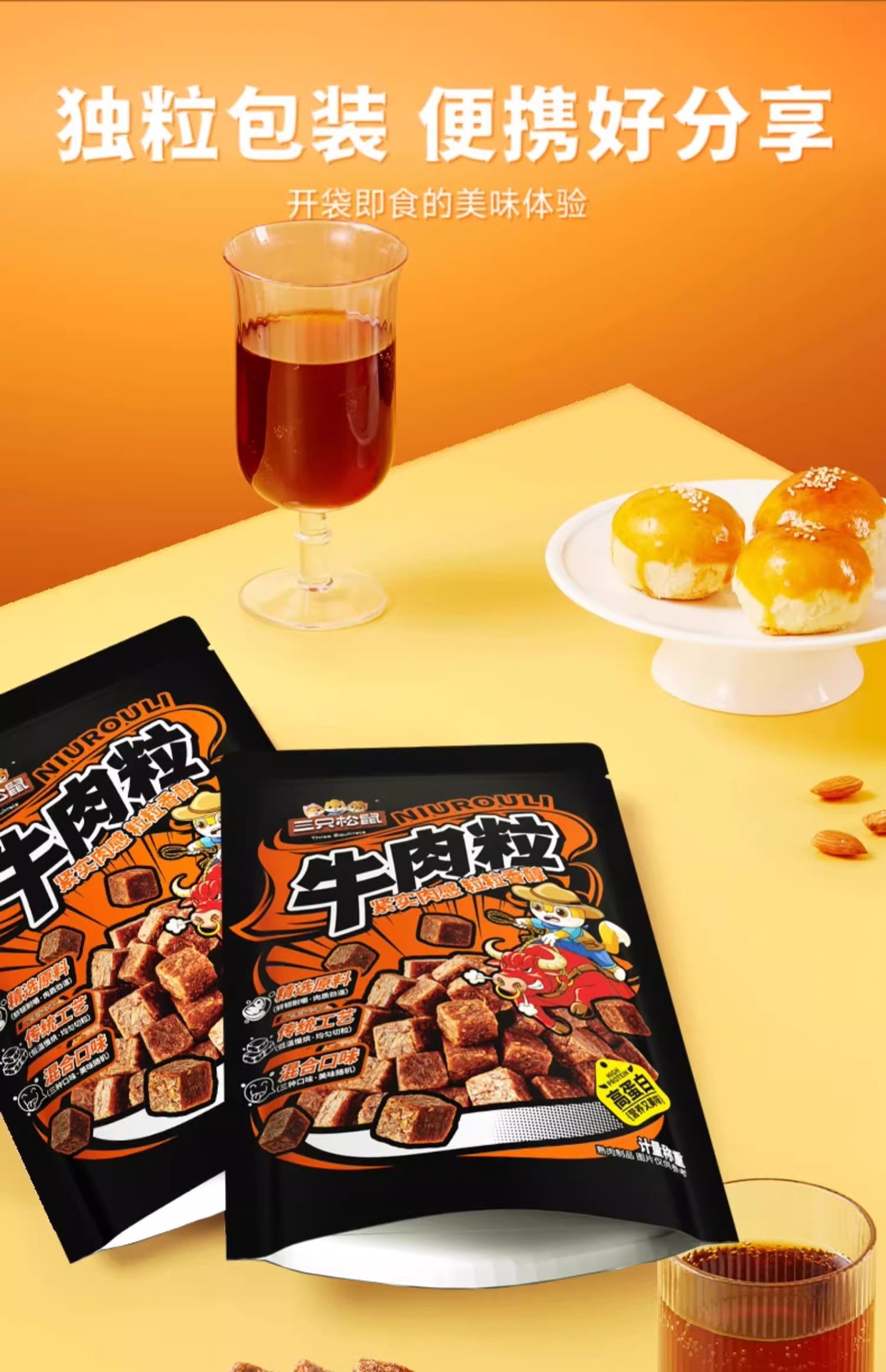 【高蛋白!嚼劲十足】三只松鼠牛肉粒混合口味高蛋白牛肉粒糖纸独立小包装肉干零食。xb