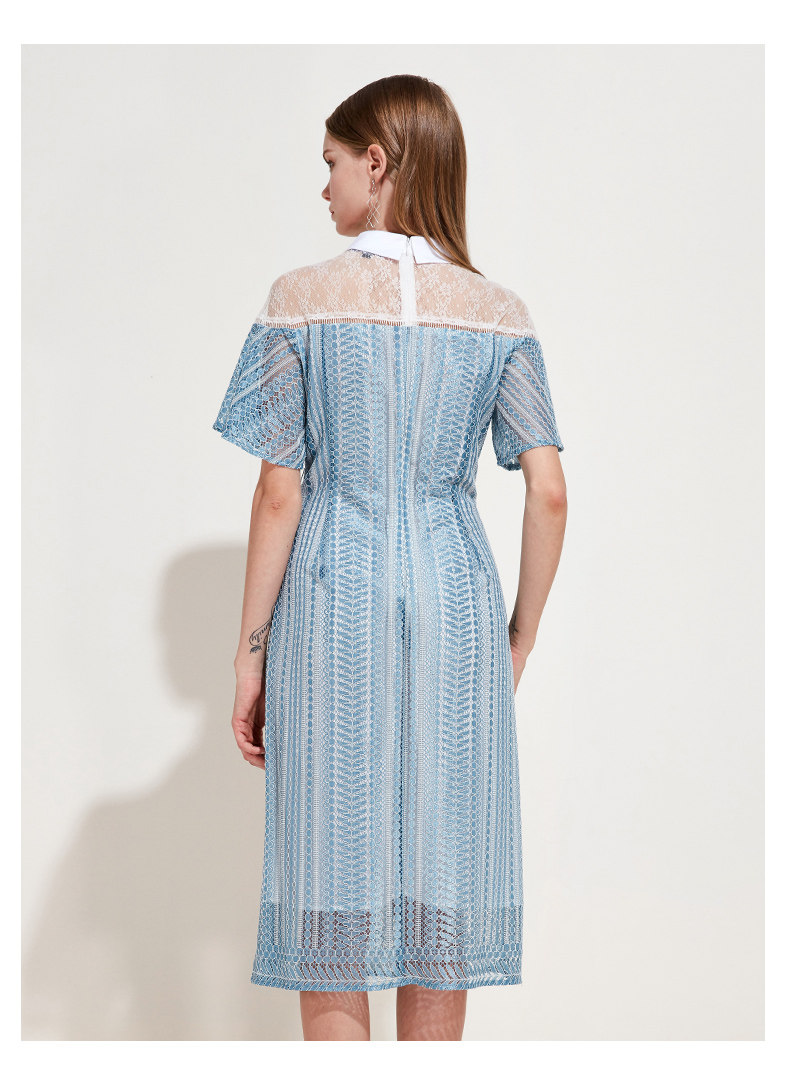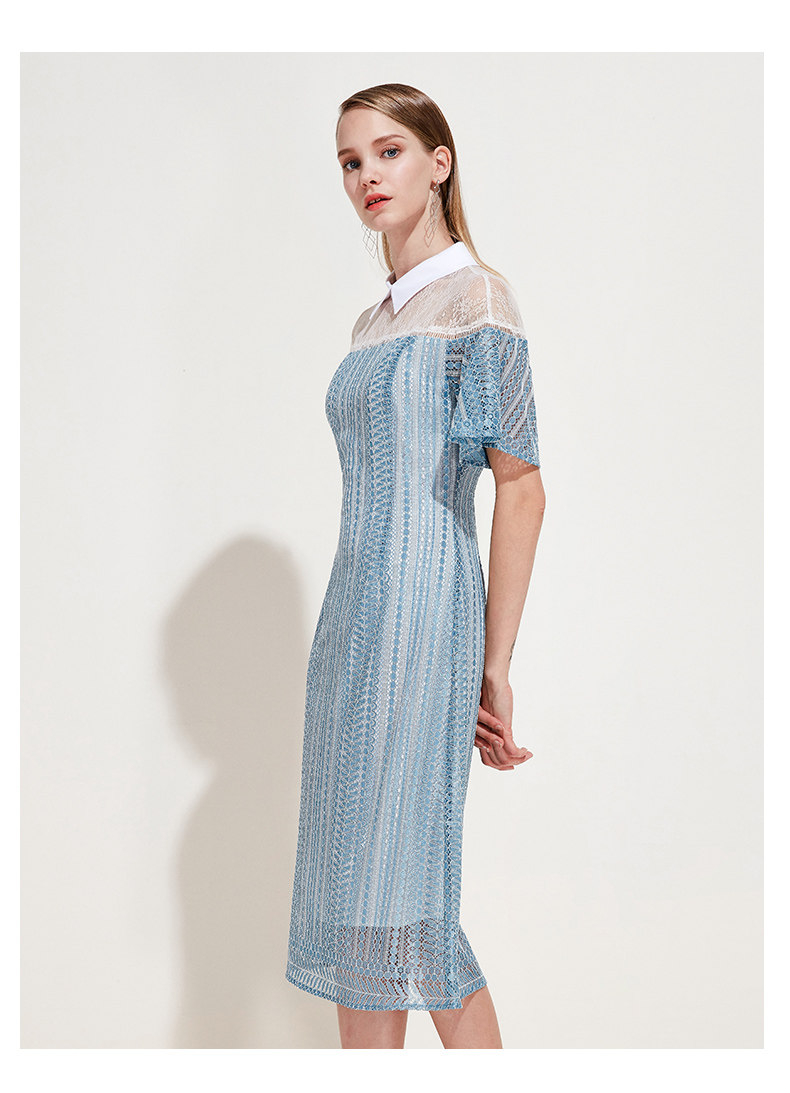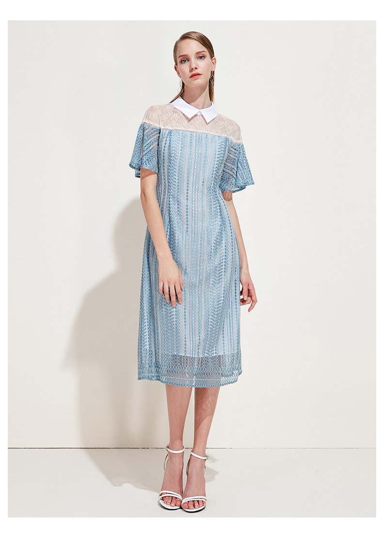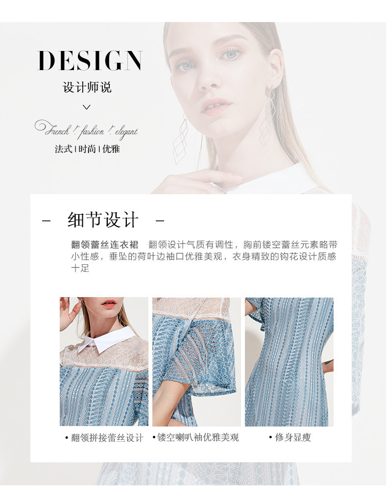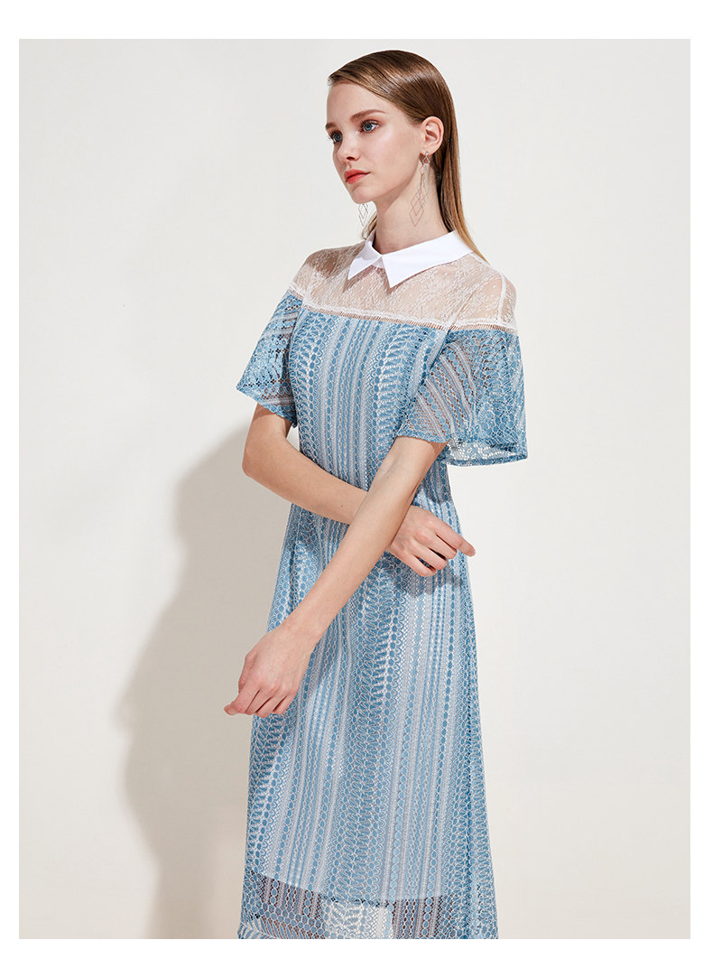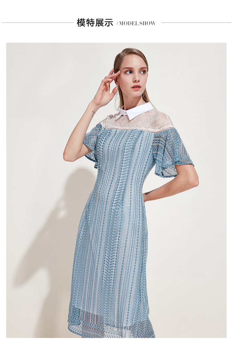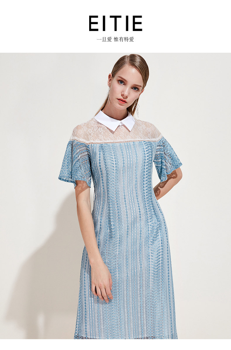 EITIE爱特爱夏季衬衣领蕾丝拼接气质小香风连衣裙中长款B1907006