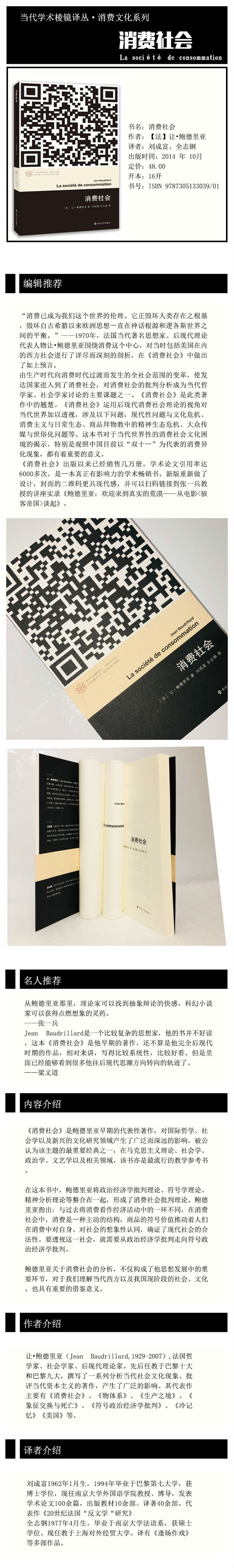 《消费社会》是鲍德里亚早期的代表性著作,对国际哲学、社会学以及新兴的文化研究领域产生了广泛而深远的影响,被公认为该主题的*重要经典之一,在马克思主义理论、社会学、政治学、文艺学以及相关领域,该书亦是*流行的教学参考书。