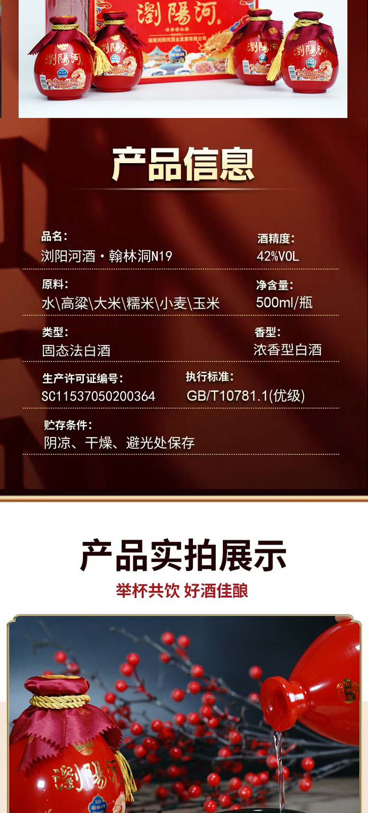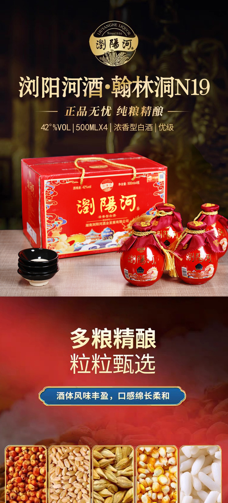 【湖南老牌名酒 非遗"老五甑"工艺 回甘似蜜】浏阳河酒·翰林洞N19 42度浓香型白酒 500ml*4瓶(送4个手工陶瓷酒碗)