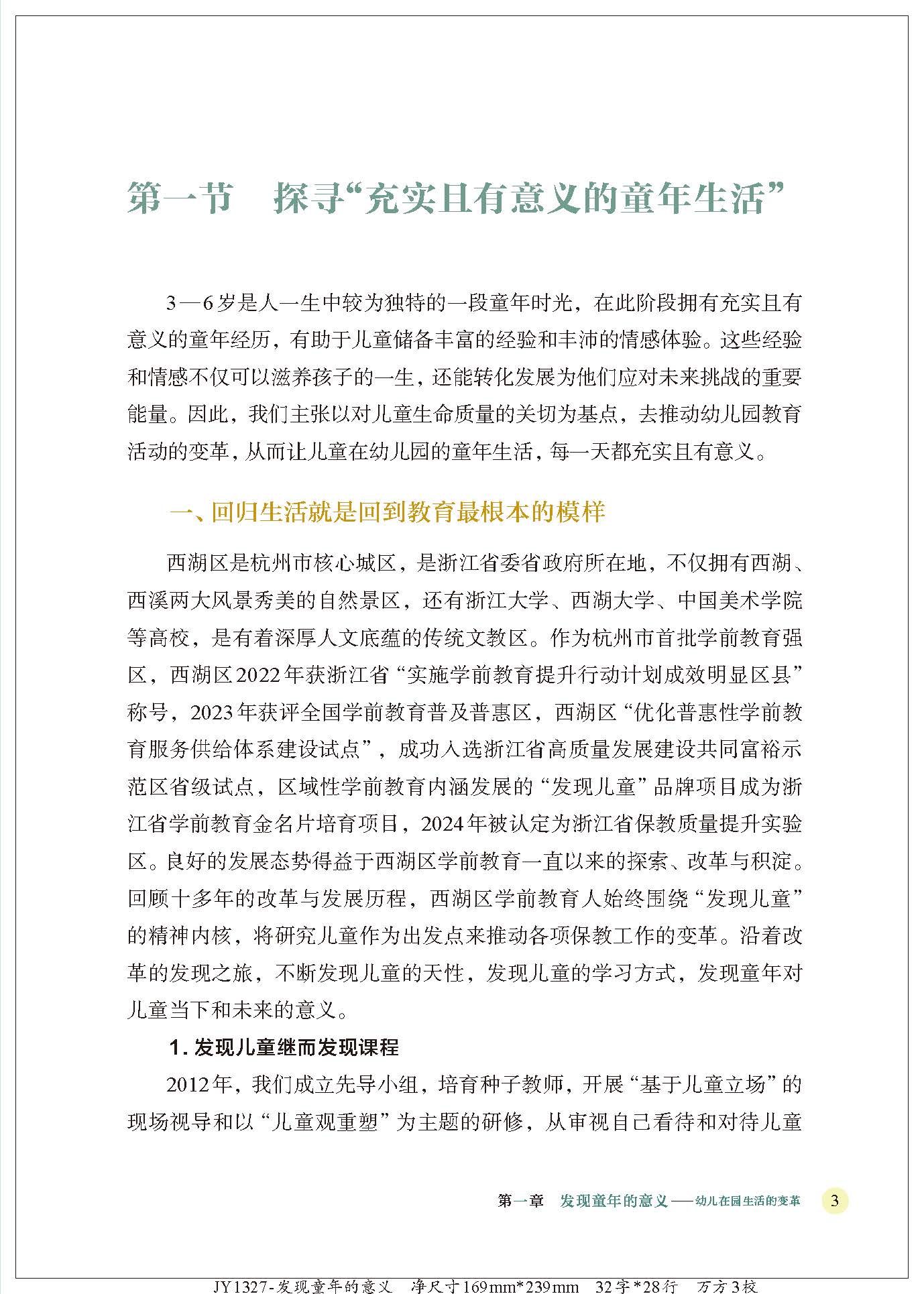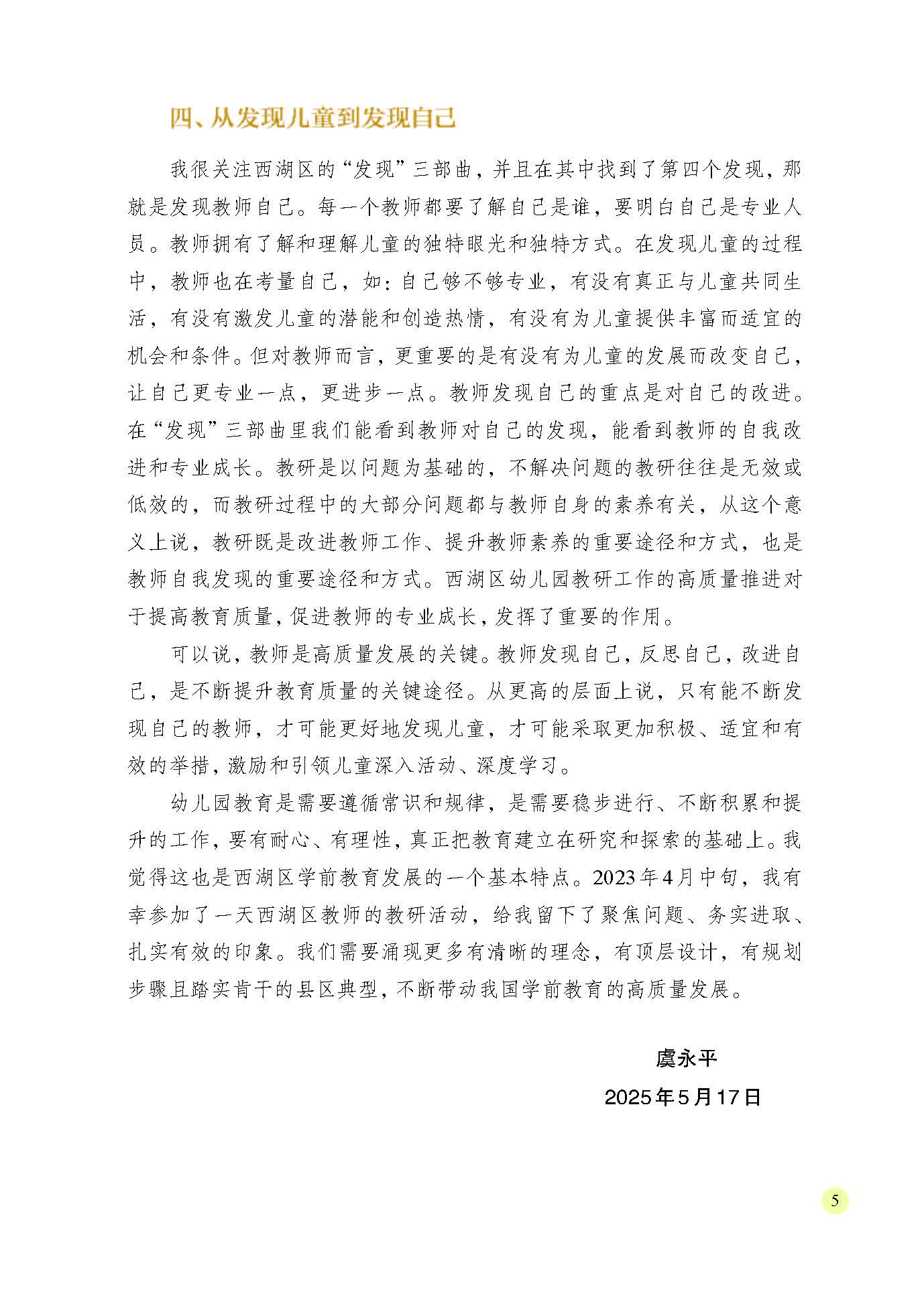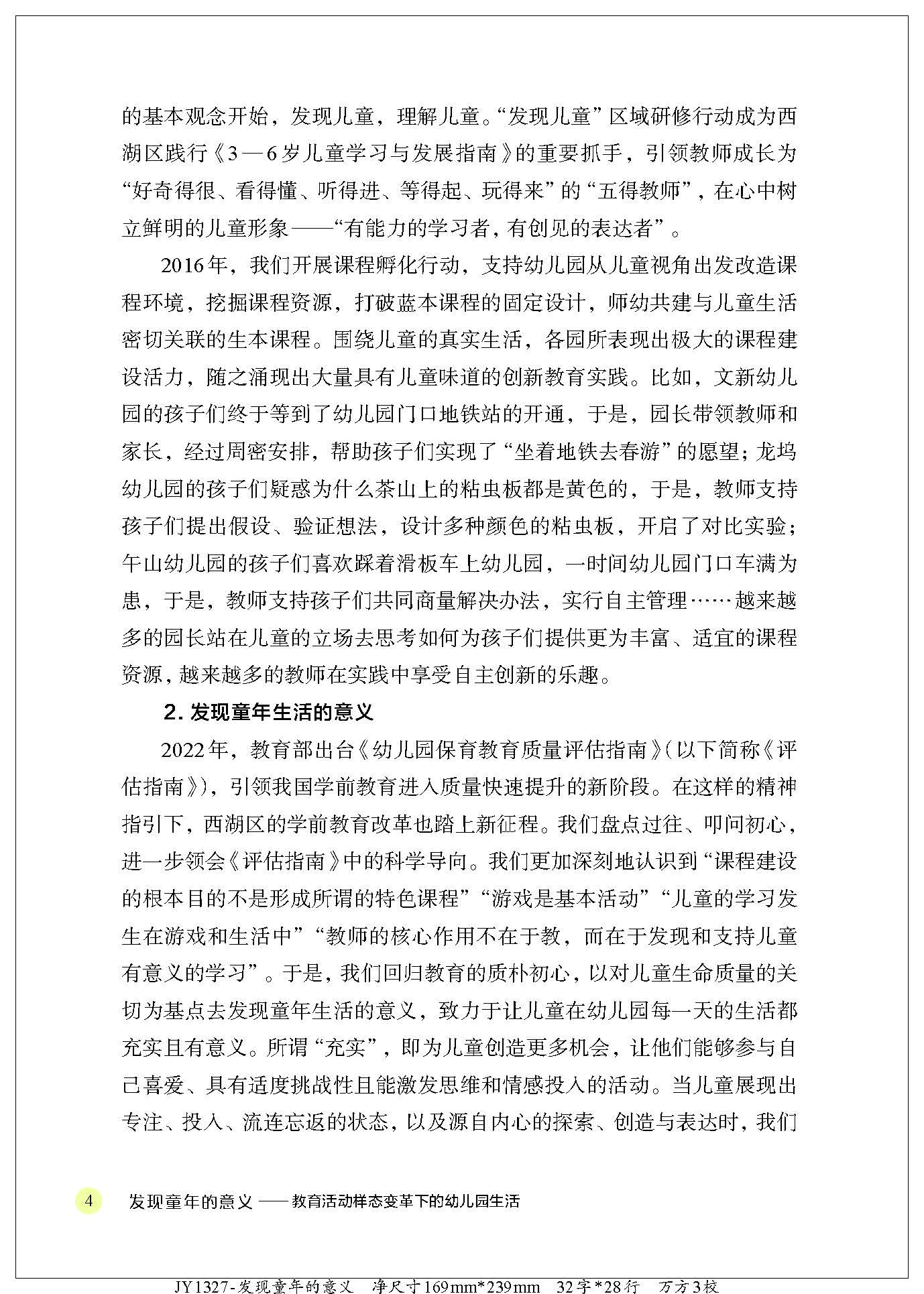 《发现童年的意义:教育活动样态变革下的幼儿园生活》是西湖区学前教育团队深耕十余年的实践结晶。书中以“发现儿童”为核心,通过 “打开别样空间”“注重亲历实践”“服务创造生活” 三大维度,系统呈现 14 类差异化教育活动样态,搭配大量真实案例与实操策略,破解“儿童自主游戏”与“教师主导教学”的断层难题。它不仅为教师提供“回应性支持”的行动支架,更引导教育者回归教育本真,助力儿童在充实且有意义的童年生活中成长为“有能力的学习者、有创见的表达者”,是推动学前教育高质量发展的实用指南。