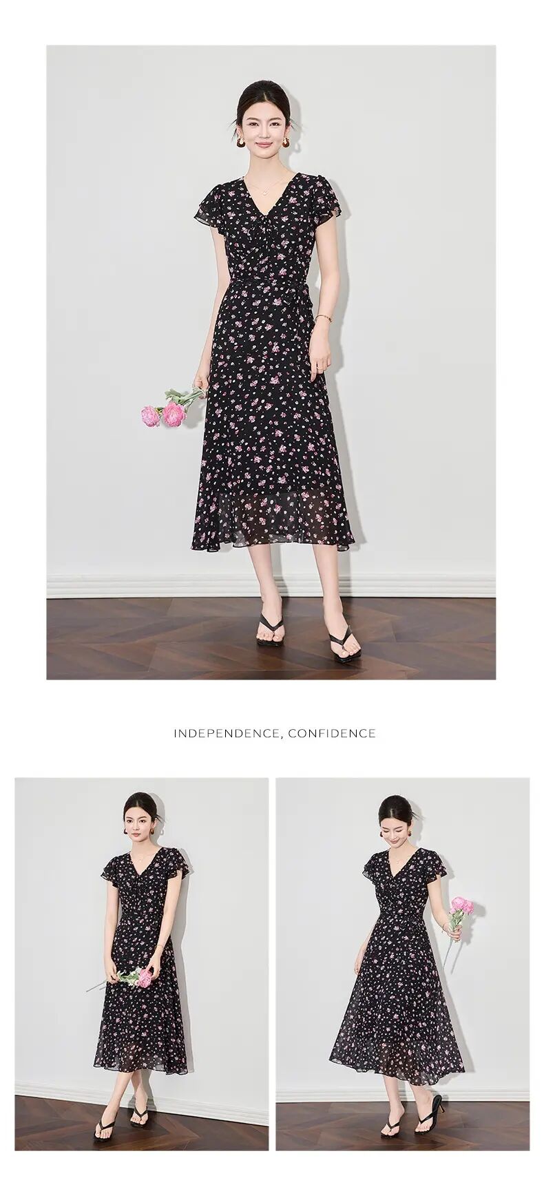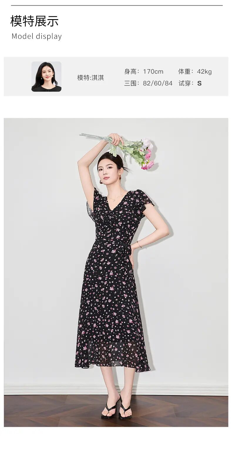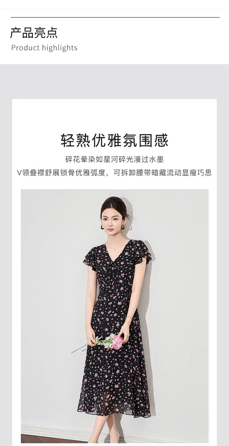 【高货wl】全新升级【铂金会员330/天猫439/差价109】(02250) 洛诗琳新款轻熟风浪漫优雅碎花V领叠襟荷叶袖收腰连衣裙女