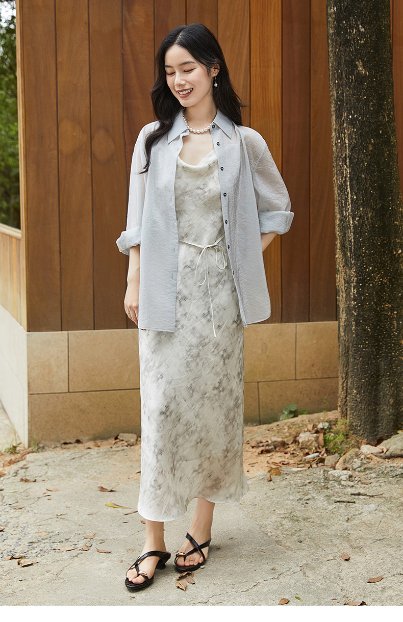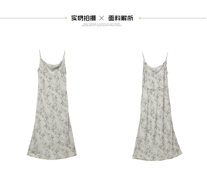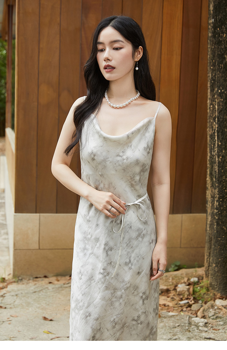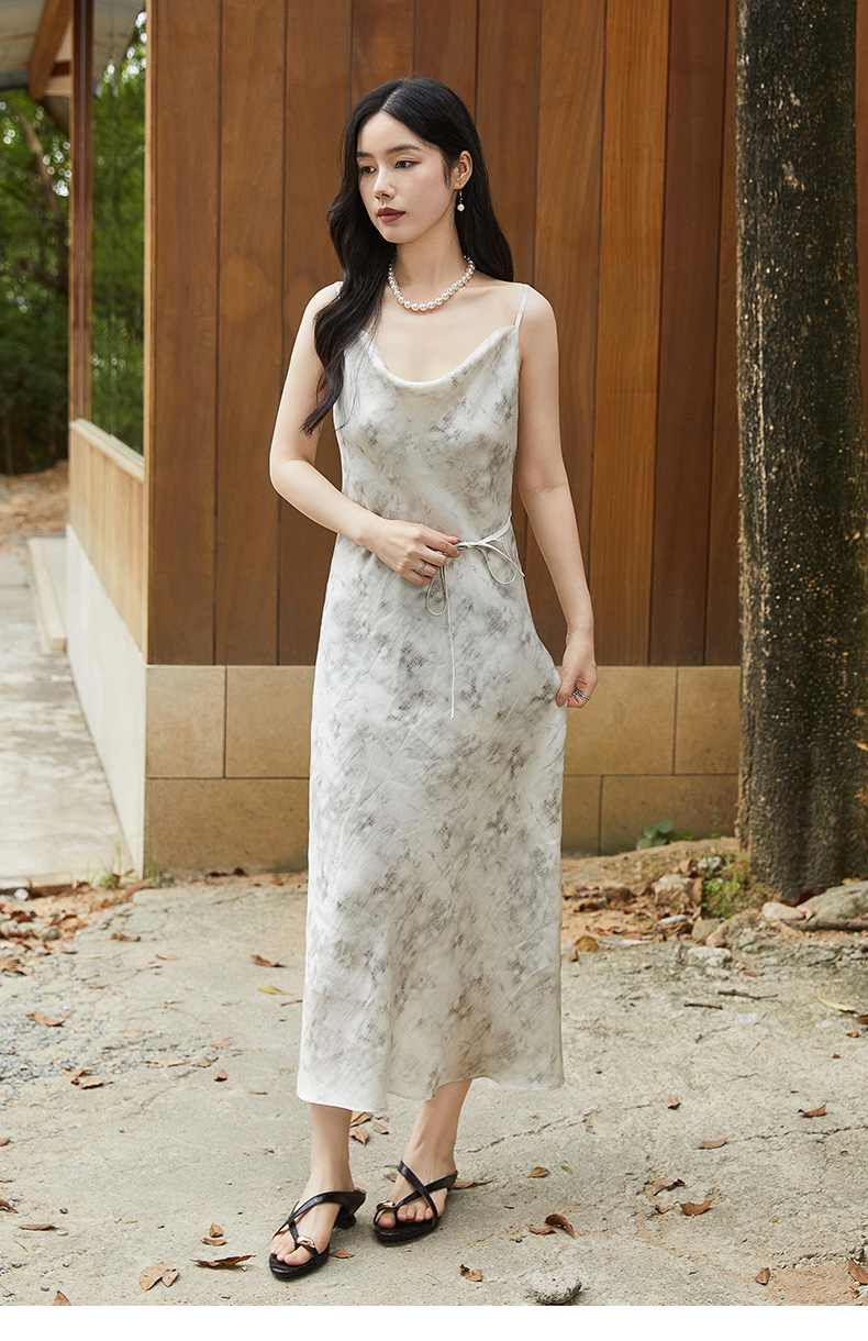 慵懒度假风水墨印花吊带长裙 垂坠感醋酸面料显瘦开叉连衣裙