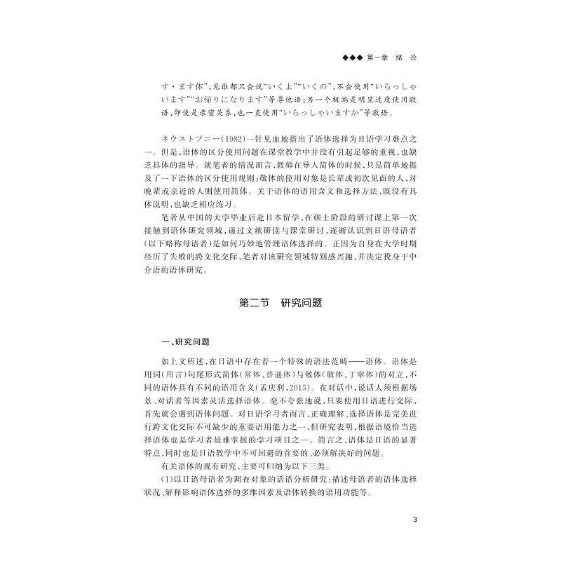 在日语习得领域,语体转换(敬体/简体、敬语使用与否等)被视为最难习得的语言项目之一。本研究以日语学习者为调查对象,一年间三次收集学习者和本族语者的对话,并对学习者的生活、学习环境和语言意识等进行深度采访,多维、深入、动态地考察学习者语体转换能力的发展轨迹。研究结果表明,语体转换能力受日语接触环境、母语社会文化、语言规约、心理、语言等多重因素的影响,而影响因素的不同组合与优先顺序是引起学习者个体差异的原因所在。这对日语教育有如下启发:(1)即使在目的语环境中,自然习得对语体习得所起的促进作用也是有限的;(2)学习者在做语体选择时,潜意识里受母语社会文化、语言规约的影响,因此语体教学中应考虑母语和目的语的异同;(3)敬语习得对学习者来说非常困难,建议在敬语教学中开展以“对方领域”为中心的指导法。