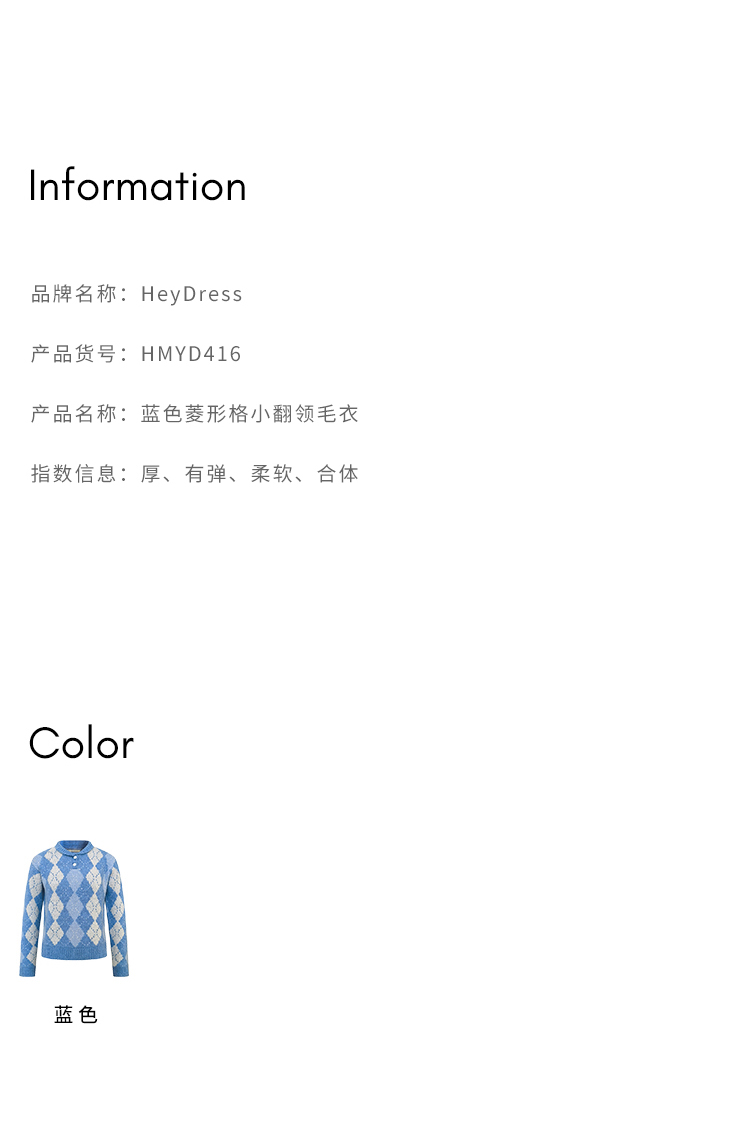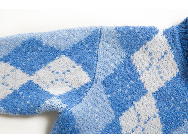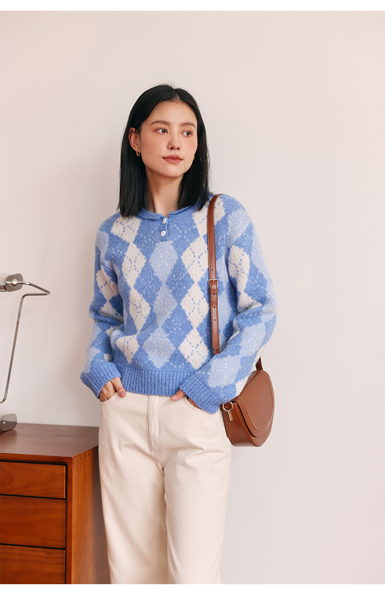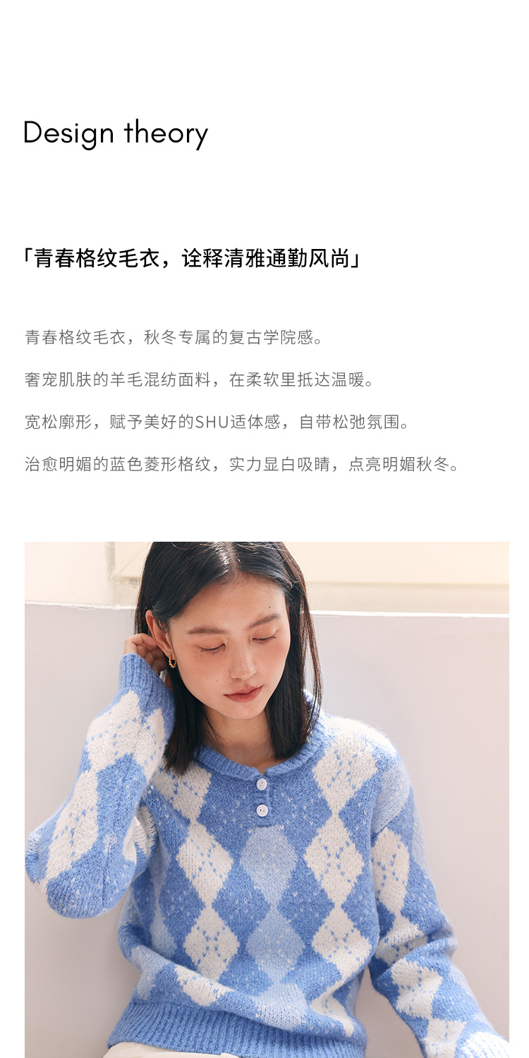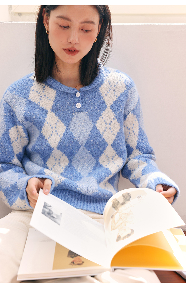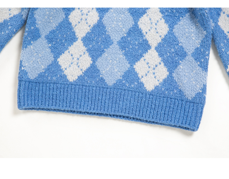 HeyDress蓝色翻领毛衣女秋冬法式复古格子设计感宽松别致针织上衣