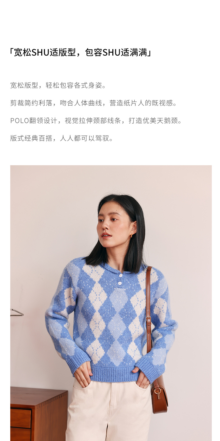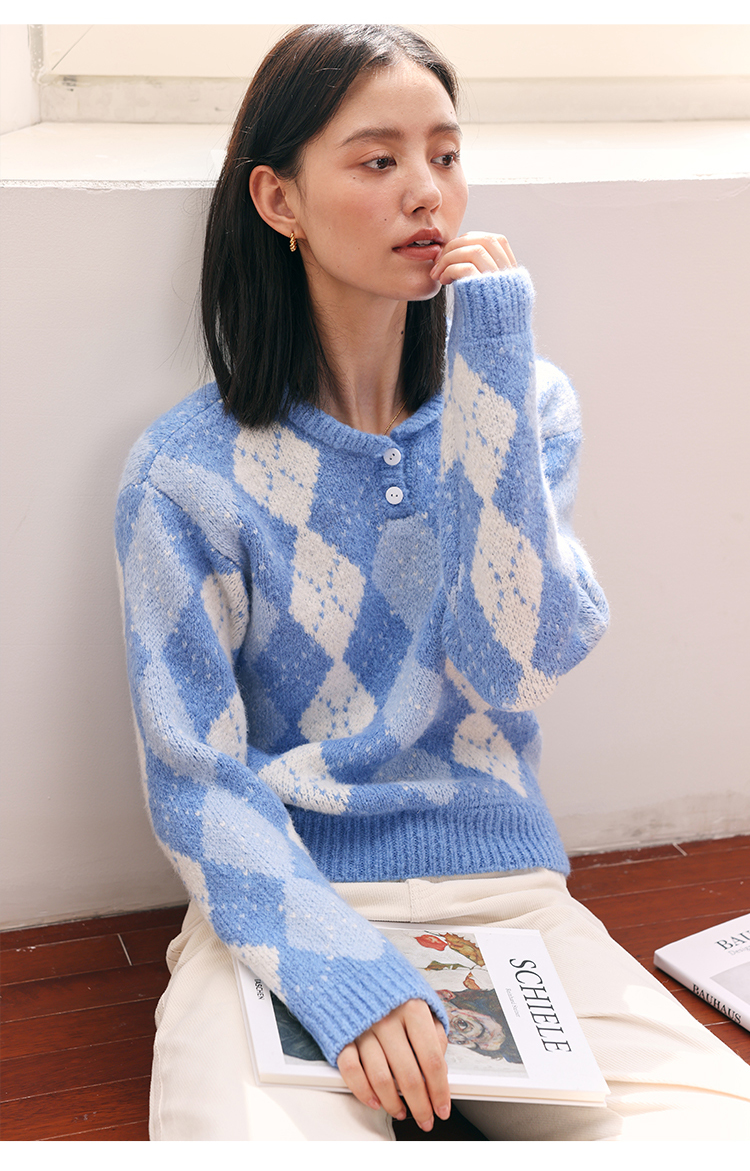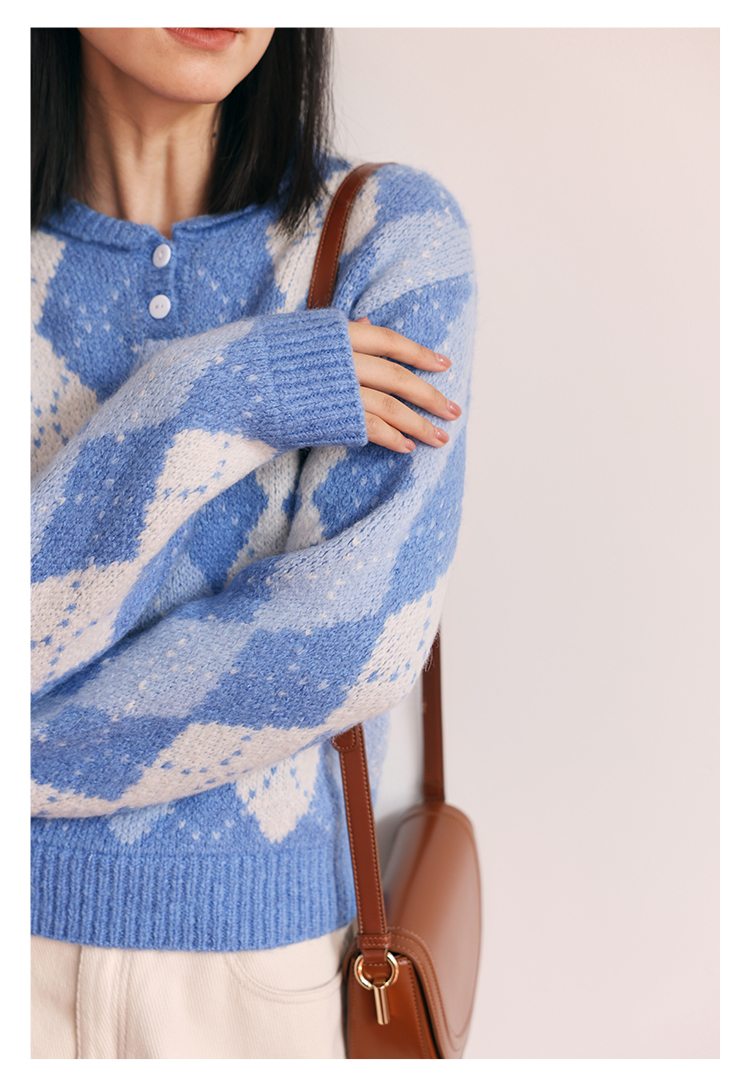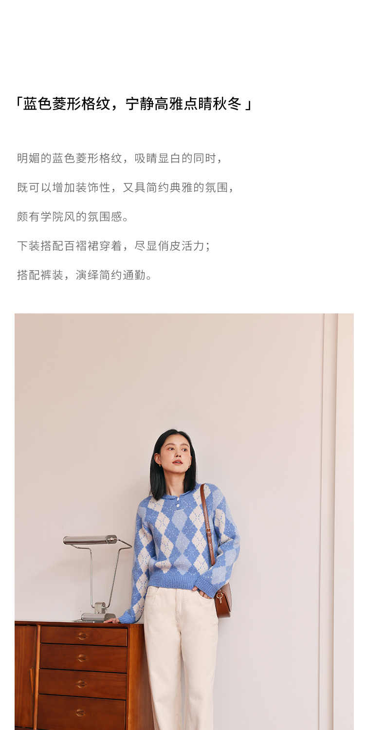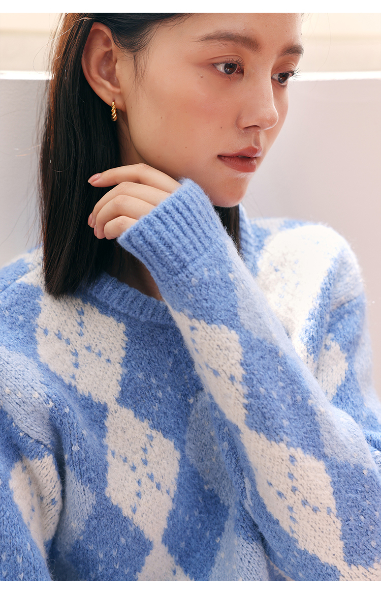 HeyDress蓝色翻领毛衣女秋冬法式复古格子设计感宽松别致针织上衣