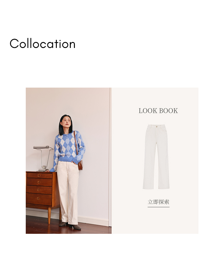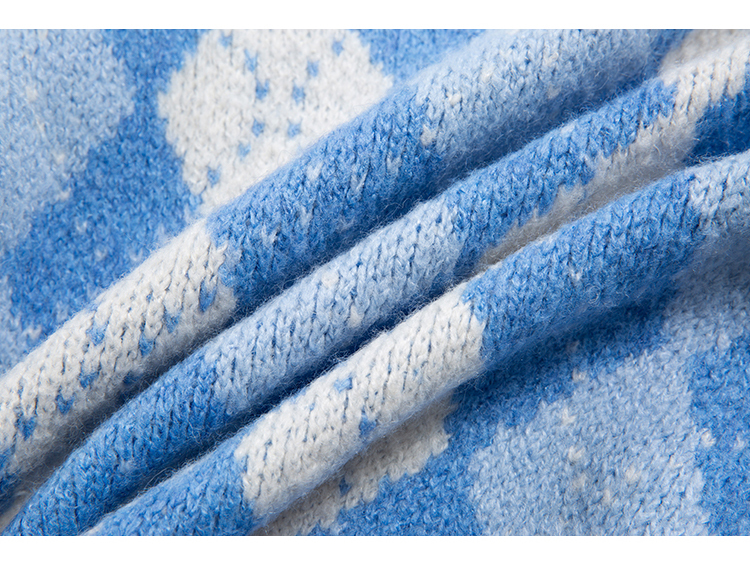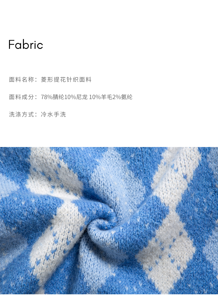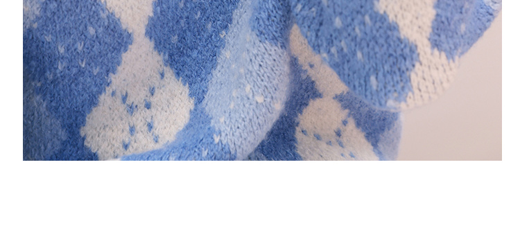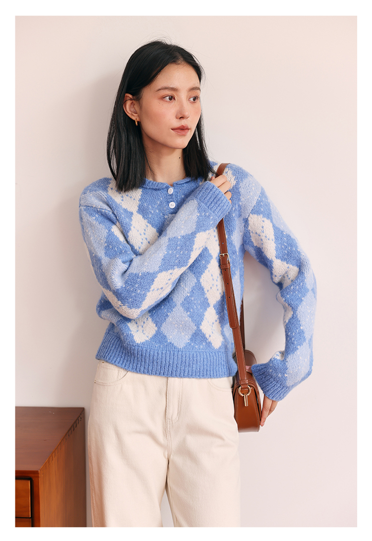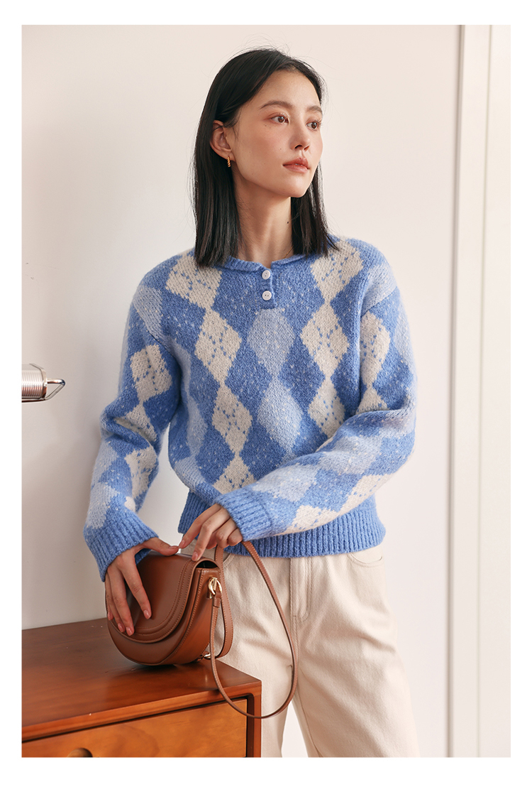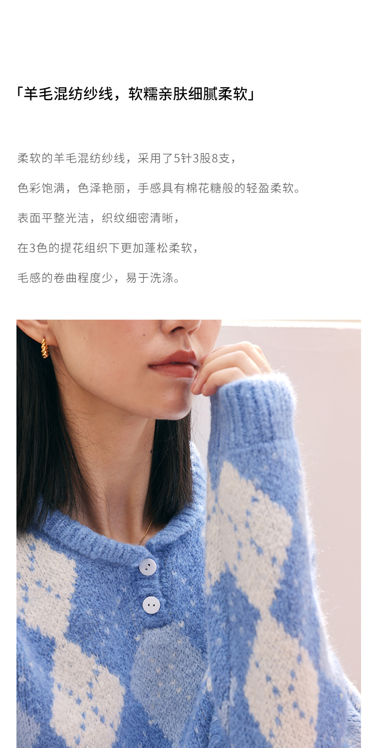 HeyDress蓝色翻领毛衣女秋冬法式复古格子设计感宽松别致针织上衣