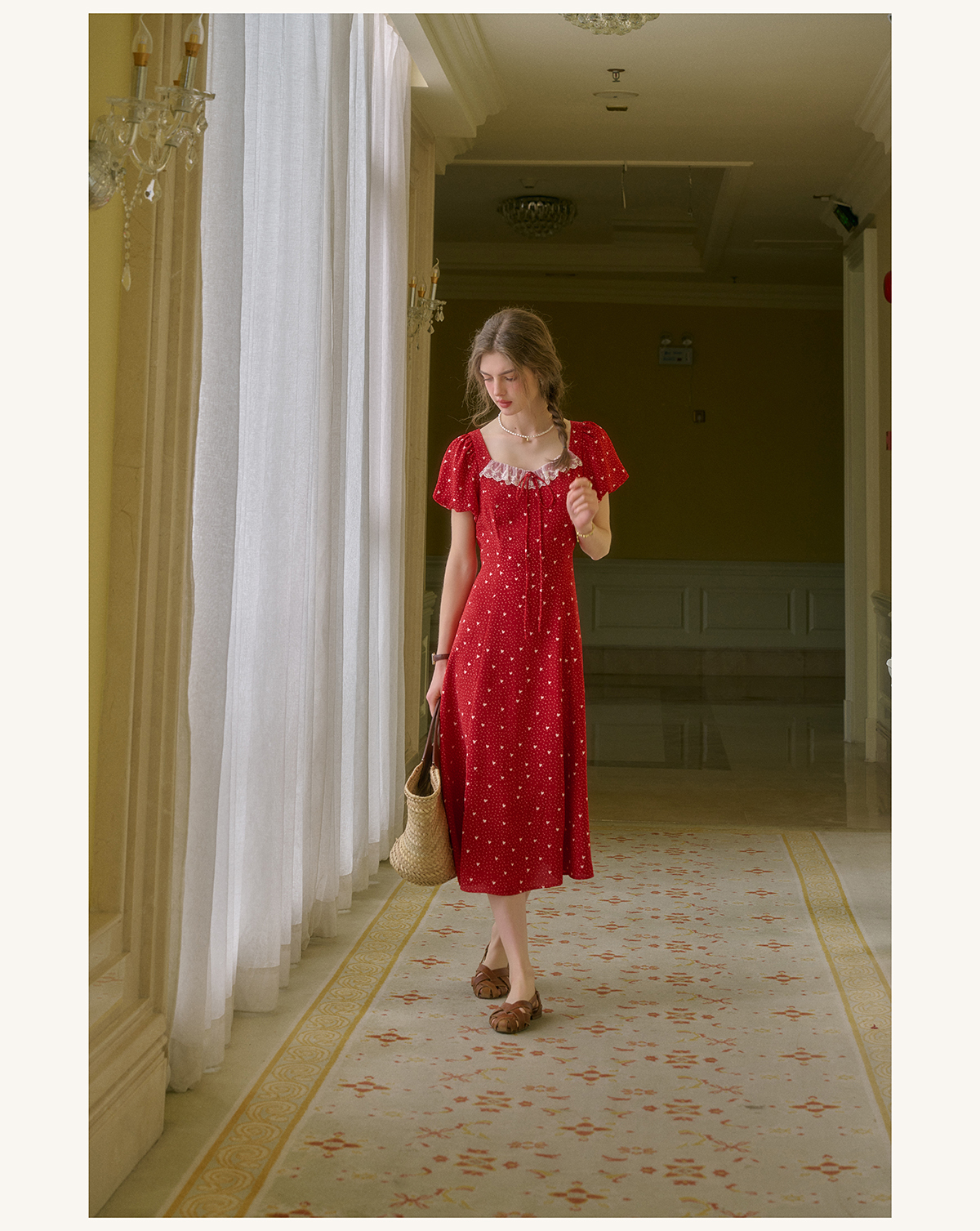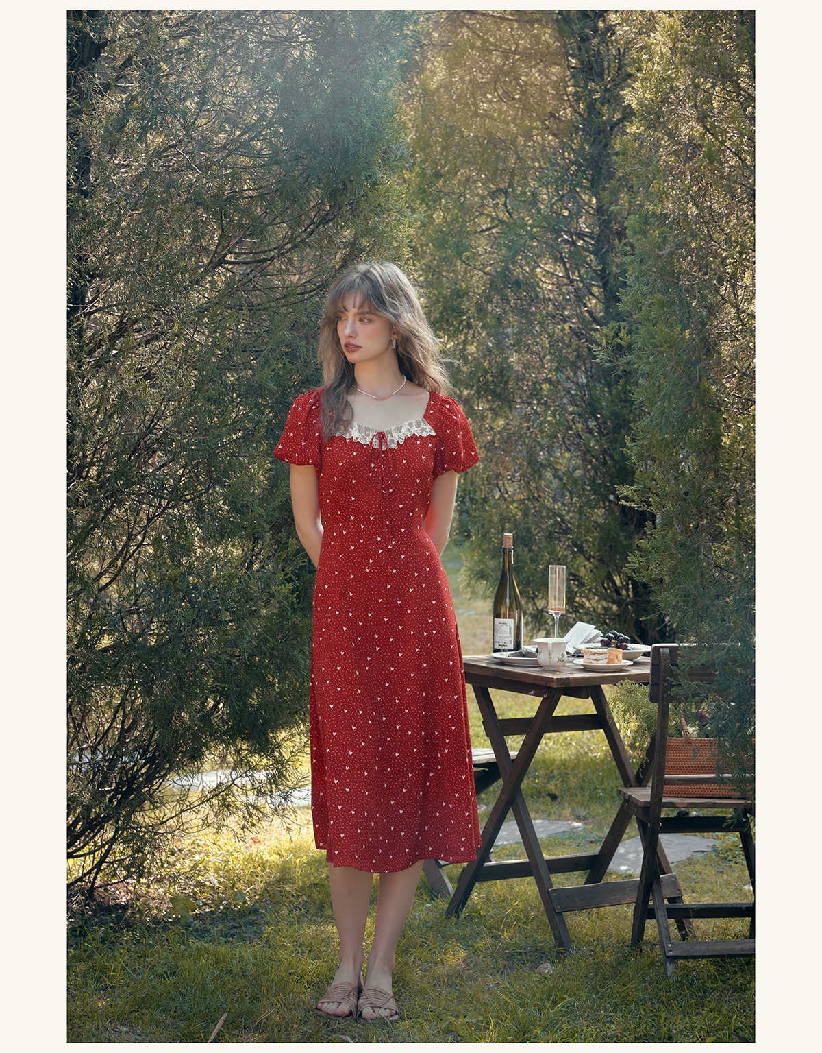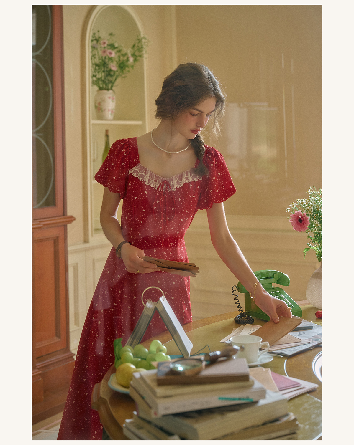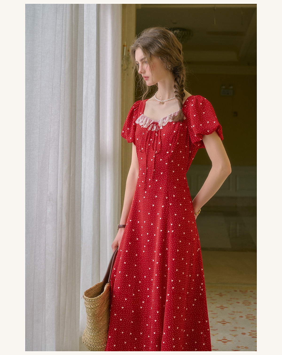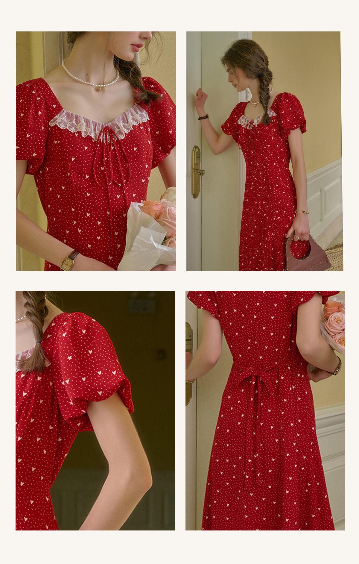 (小眠专属)SimpleRetro心愿精灵 经典蕾丝法式方领连衣裙女复古泡泡袖波点裙