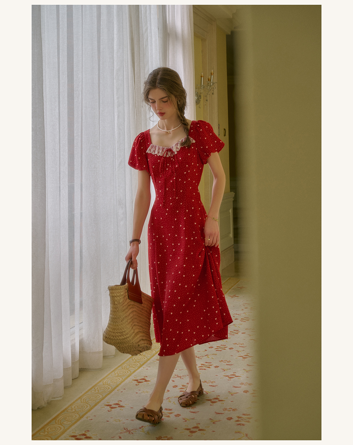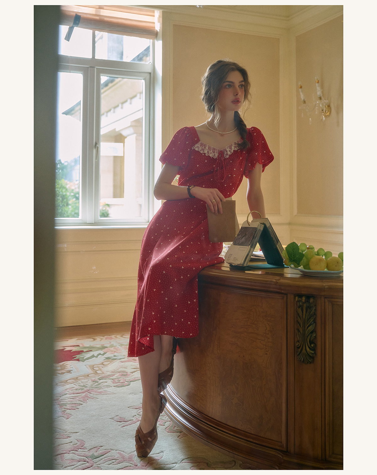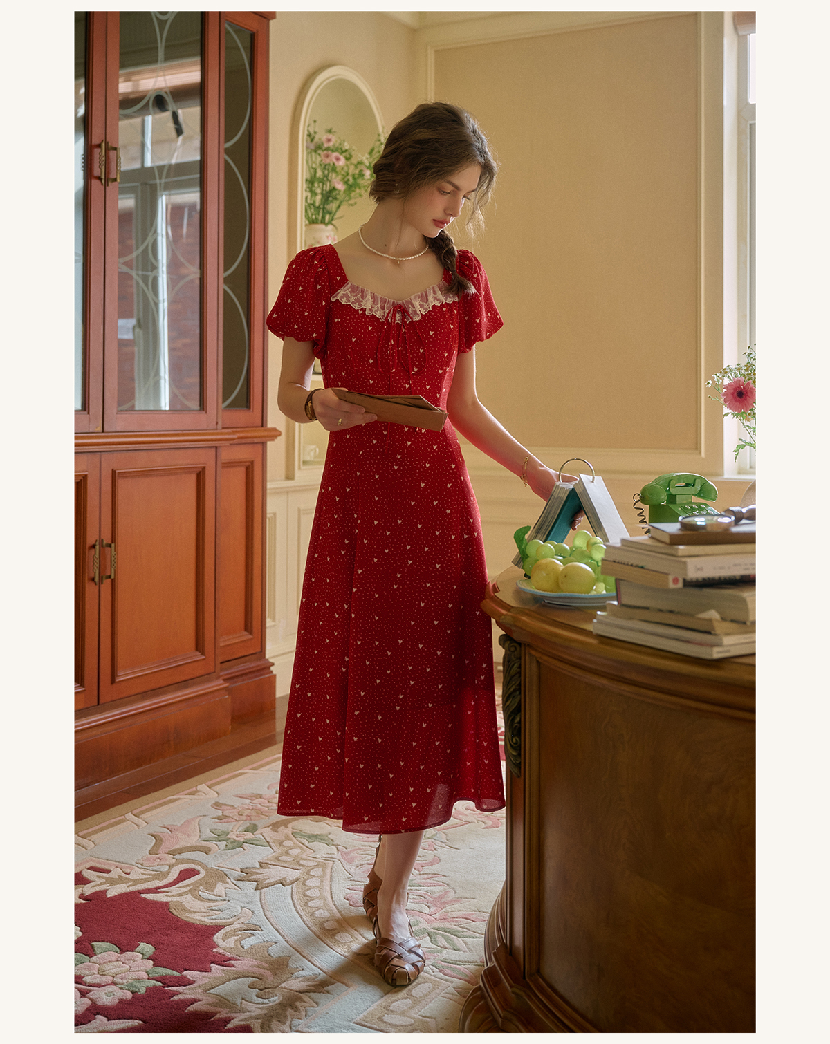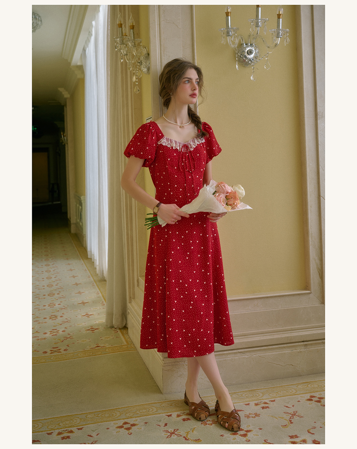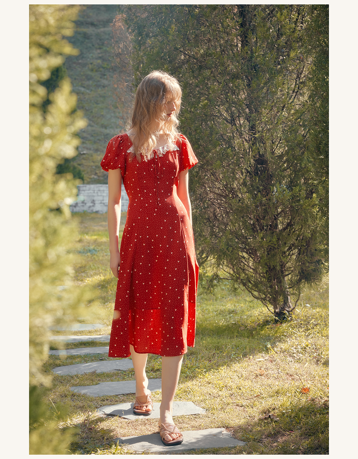 (小眠专属)SimpleRetro心愿精灵 经典蕾丝法式方领连衣裙女复古泡泡袖波点裙