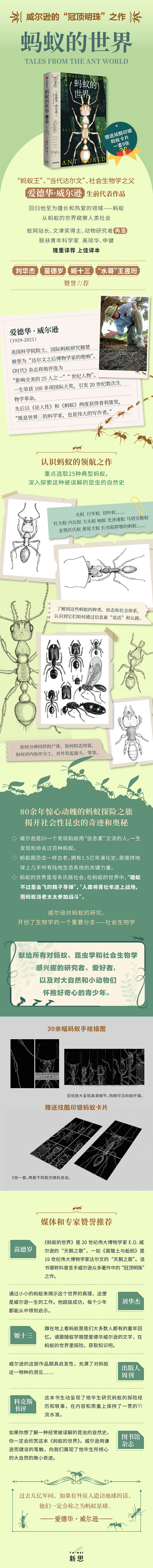 ★ “蚂蚁王”、社会生物学之父、当今世界生物学翘楚爱德华·威尔逊生前的Zui后一部作品,回归起初让他心动的领域——蚂蚁,唤起他一生精彩斐然的蚂蚁探险之旅。威尔逊称得上是世界研究蚂蚁第YI人,他的成就和思想建立在对蚂蚁的研究上,这也促使他创建了社会生物学。这本书将是你认识蚂蚁的领航之作。