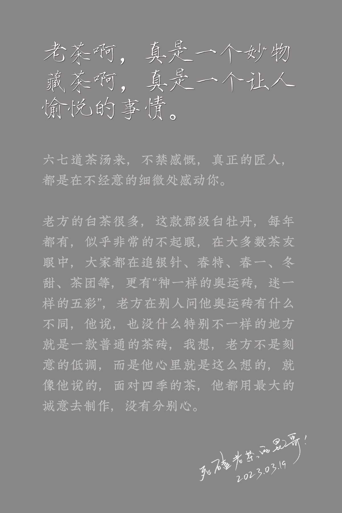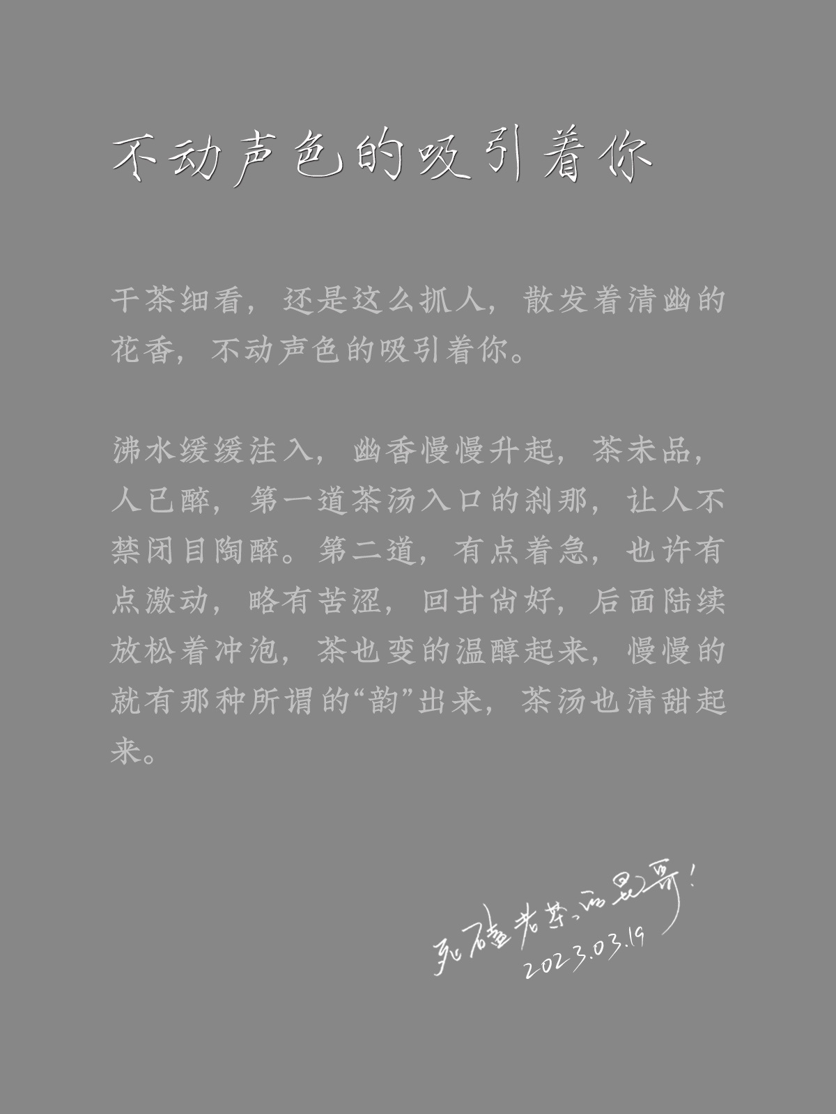 - 2021年,嘉木会创办了“藏茶密室”,开启了全新的藏茶模式,秉持“不将就,不迎合”的理念,通过“选、藏、养、醒”的方式,再度诠释藏茶的深意,沉醉杯汤,苦乐自知,茗透于心,迷之不悔!
