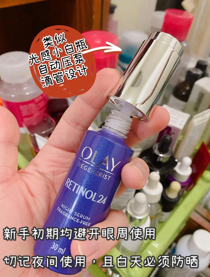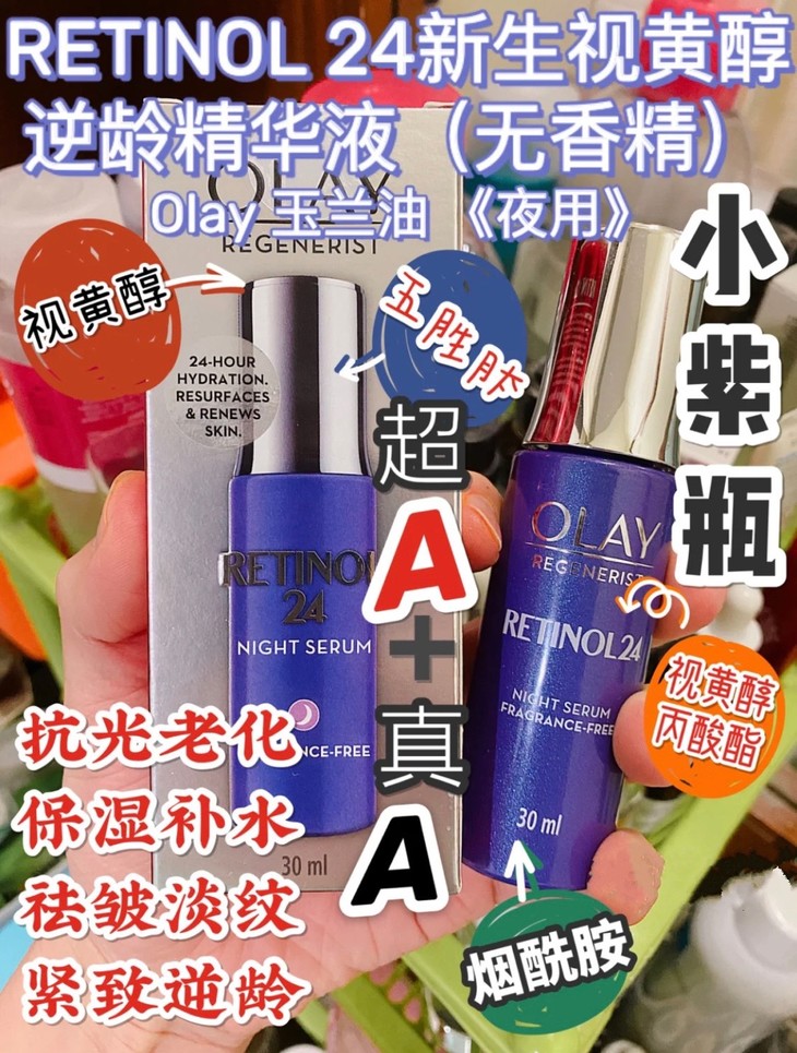👑OLAY 玉兰油视黄醇24小时保湿夜间精华液30ML 👍抗光老化、保湿补水、去皱淡纹、紧致逆龄。 🔥“超A系列”北美一上市口碑就爆了,维A醇+烟酰胺+五胜肽配方 ✅一次满足美白+抗老+保湿的多重需求☺️ 🎉滋润不油腻,无香精更温和~混干皮用一点也不干。 ✨温馨提示:含维A醇配方,准妈妈及哺乳期妈妈慎入,毕竟宝宝的安全才是第一位。 ❤再提示,可能含有致痘风险成分,严重敏感皮及痘皮需权衡风险。