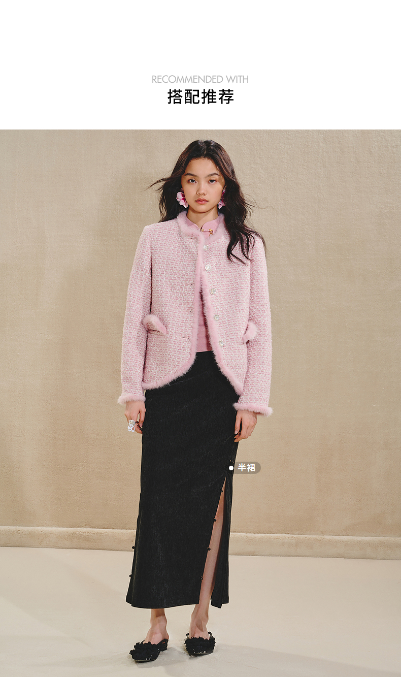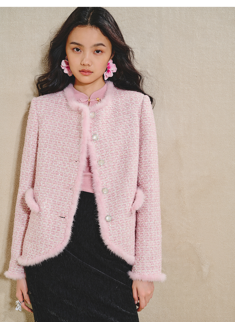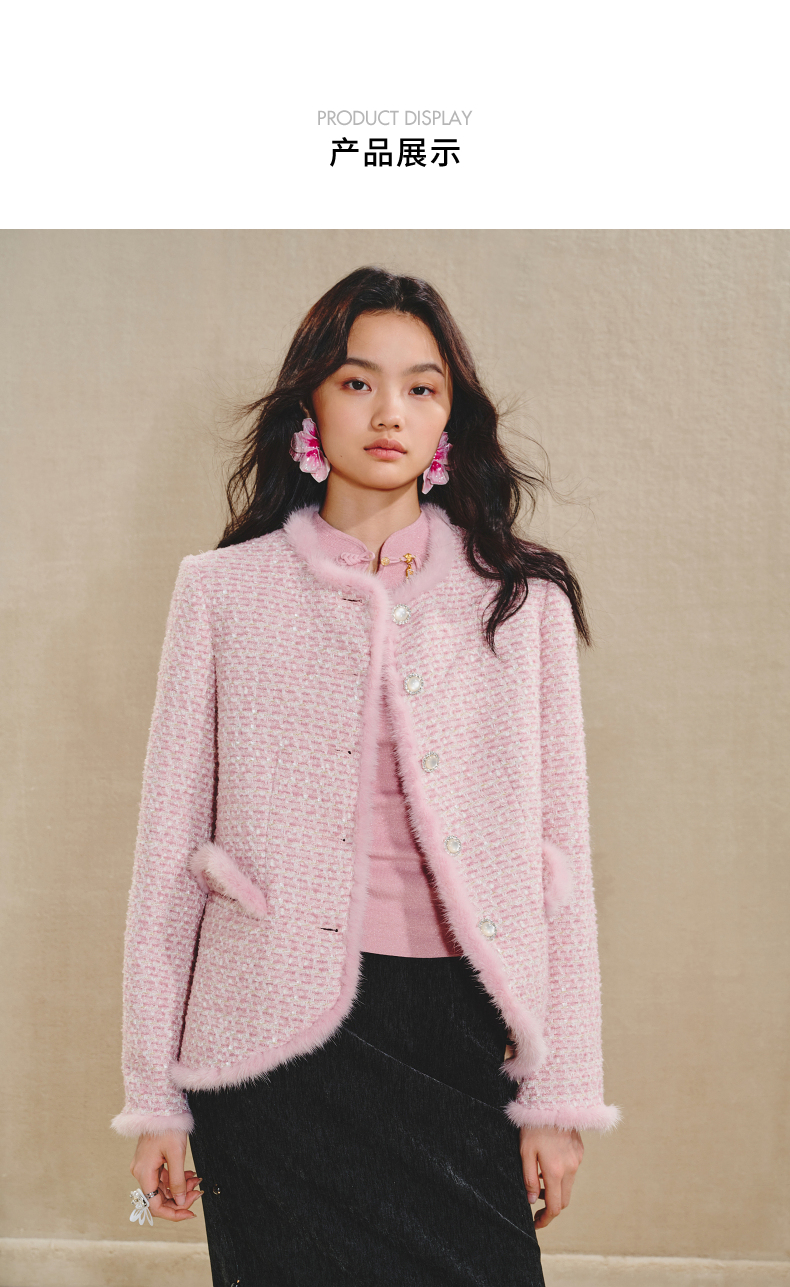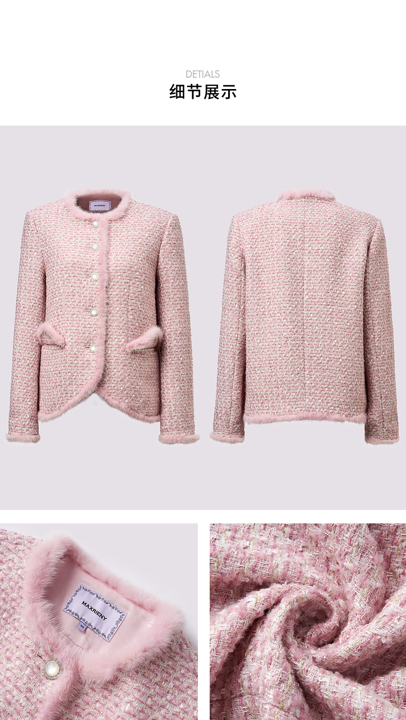 MAXRIENY贵雅浪漫感花纱外套水貂毛边2024秋冬新款上衣女(货号:MS85JA512)