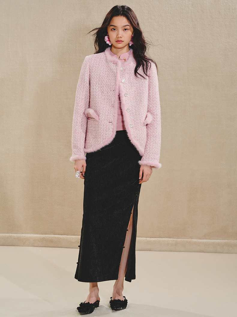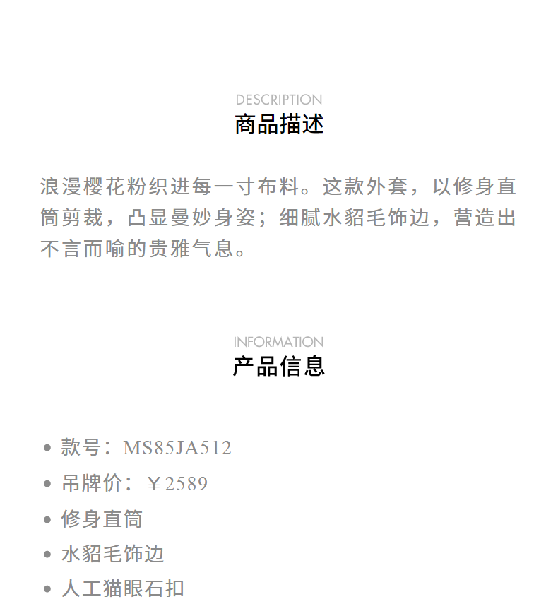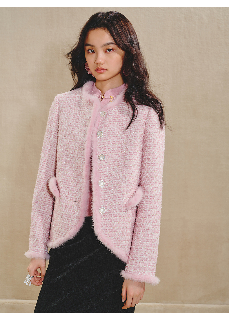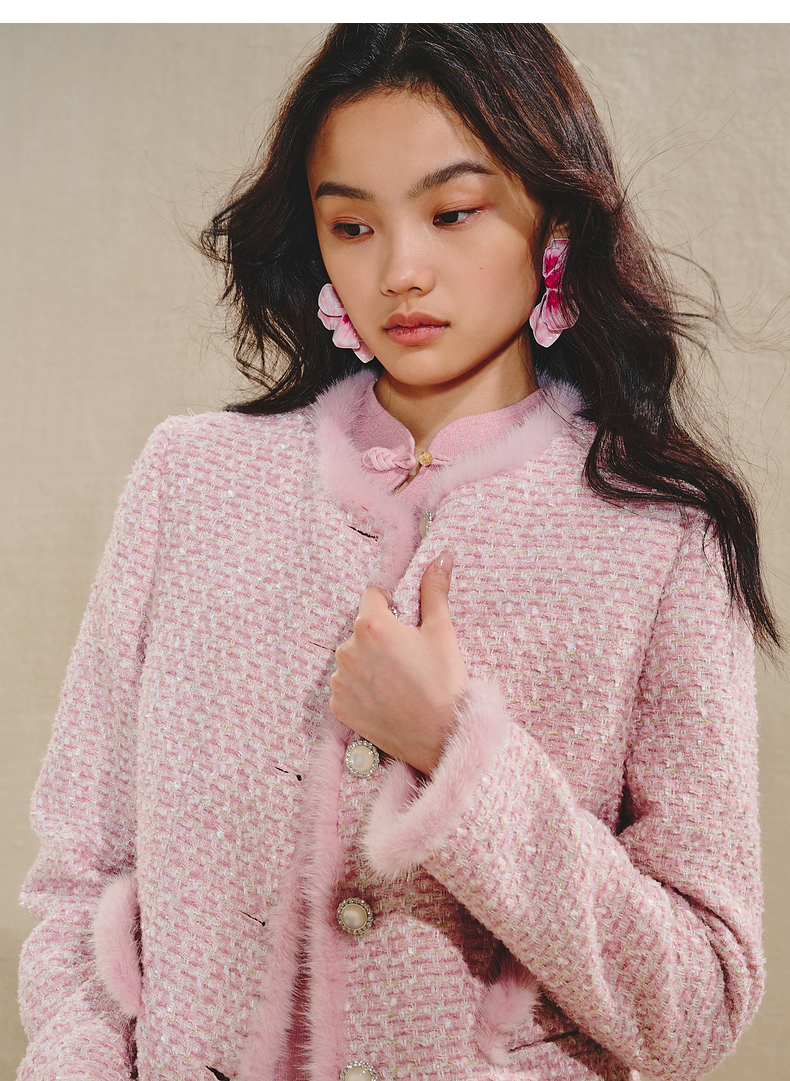 MAXRIENY贵雅浪漫感花纱外套水貂毛边2024秋冬新款上衣女(货号:MS85JA512)