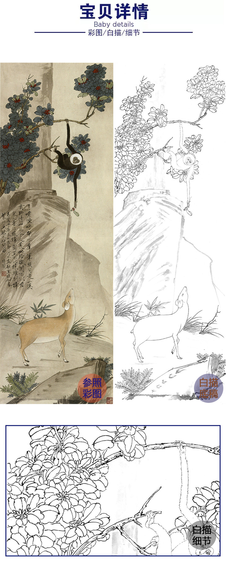 于非闇竖幅工笔花鸟白描底稿《猿獐图》-多种白描尺寸可选-YF19