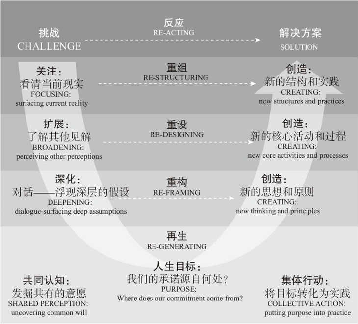 通过这些步骤,U型理论让领导者上升到一个更高的思考维度,打通个人内在与组织创新的隔膜,催生新的经济和商业、金融范式。
