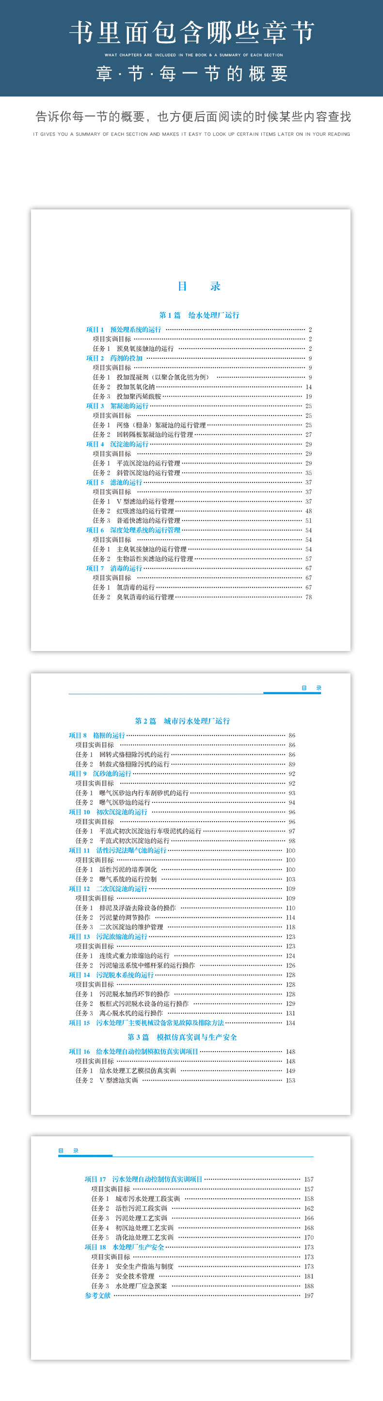 本书通过水处理运行的典型案例和模拟仿真手段,以任务为引领,项目为主导,以项目和任务开展教学实践活动,包括三大模块:第一篇给水处理厂运行;第二篇城市污水处理厂运行;第三篇模拟仿真与安全生产,共有17个学习项目,43个学习任务,从任务、项目到大模块,有紧密的逻辑联系,但各模块仍然相对独立,以利于学生全面和系统掌握城市给水和污水处理厂的运行技能。
