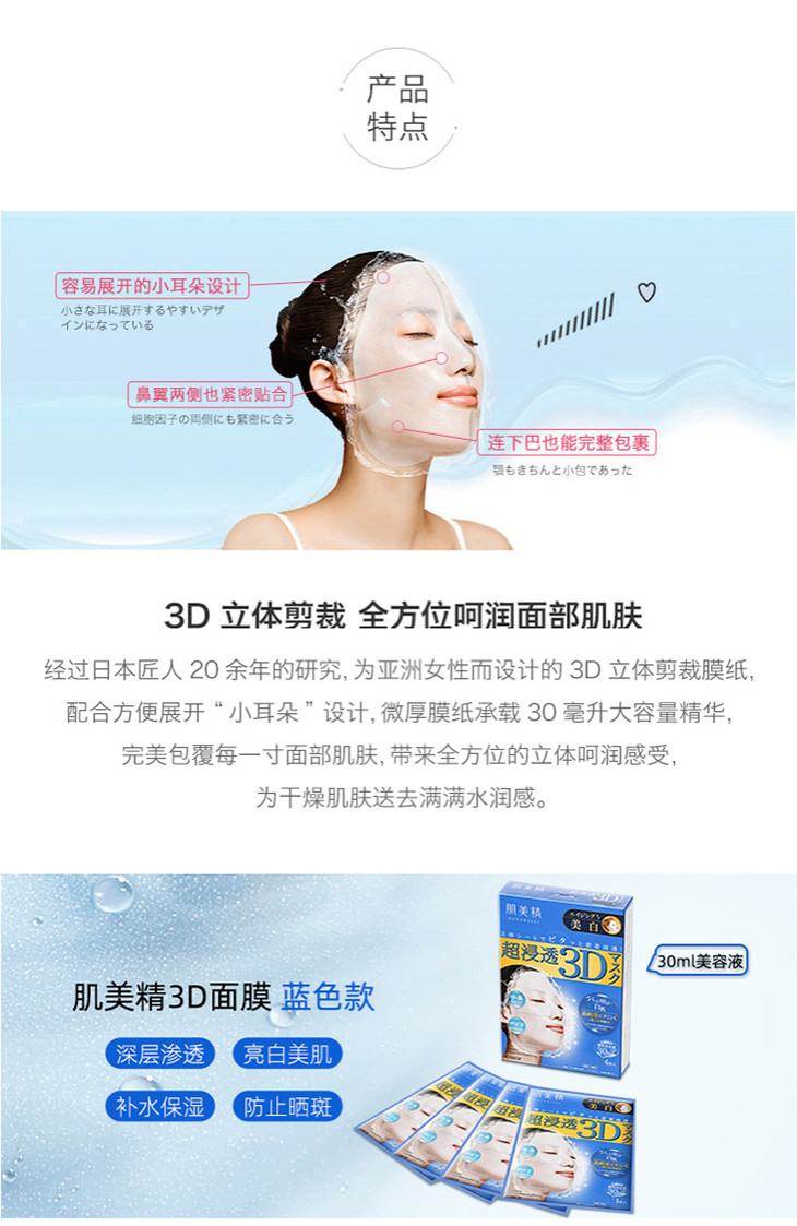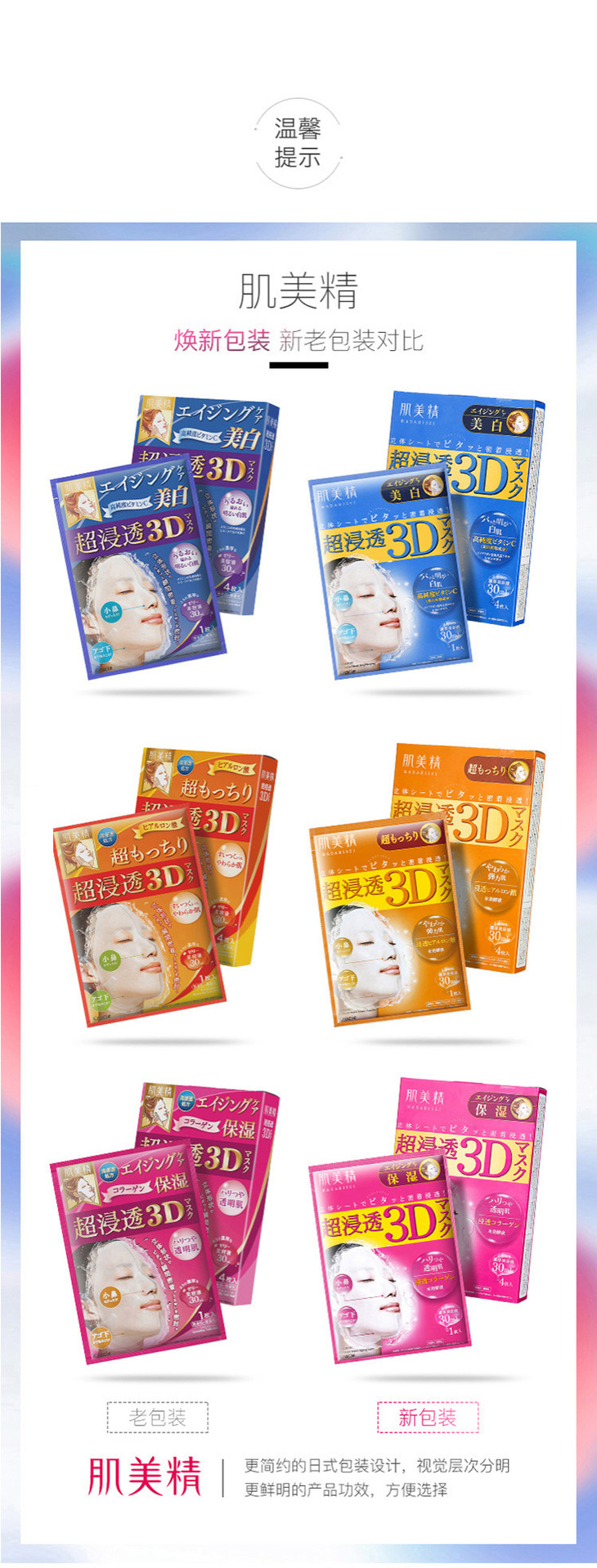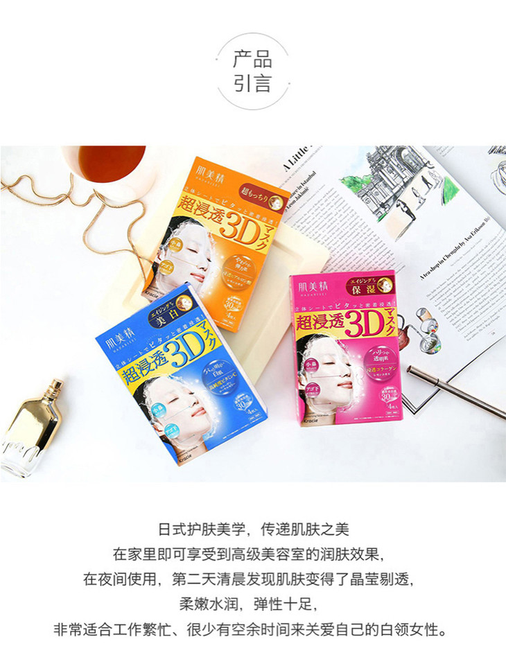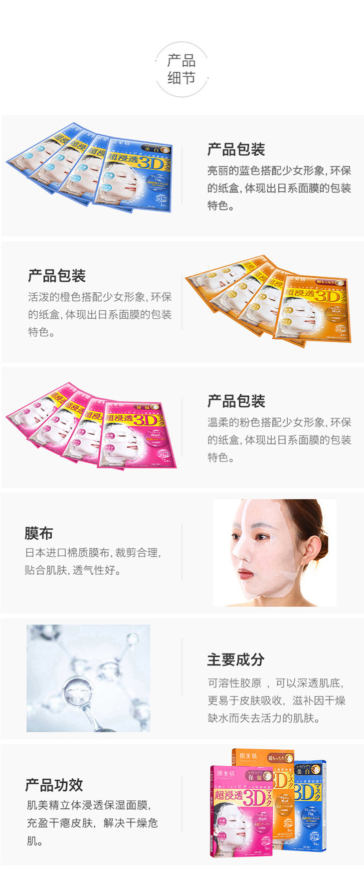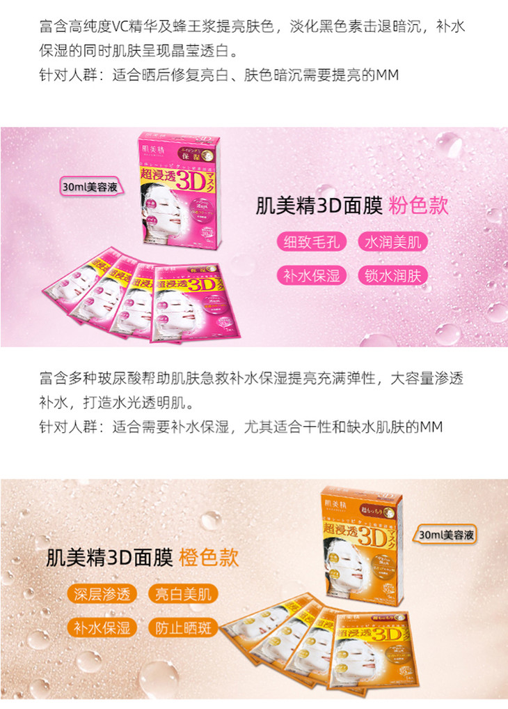 👑Kracie肌美精3D面膜#粉色/#蓝色/#橙色新包装 👍粉色主打:补水保湿,富含多种玻尿酸,适合干性和缺水性肌肤 💧#蓝色主打:美白亮白,适合晒后修复亮白,肤色暗沉需提亮的妹子 🎉#橙色主:打高效锁水,收敛紧致去暗黄,适合肌肤松弛,缺水暗黄,需增加骨胶原蛋白 👃立体剪裁,折痕连鼻子鼻翼两边,不易贴合的地方都非常地贴合,精华液浓稠充足