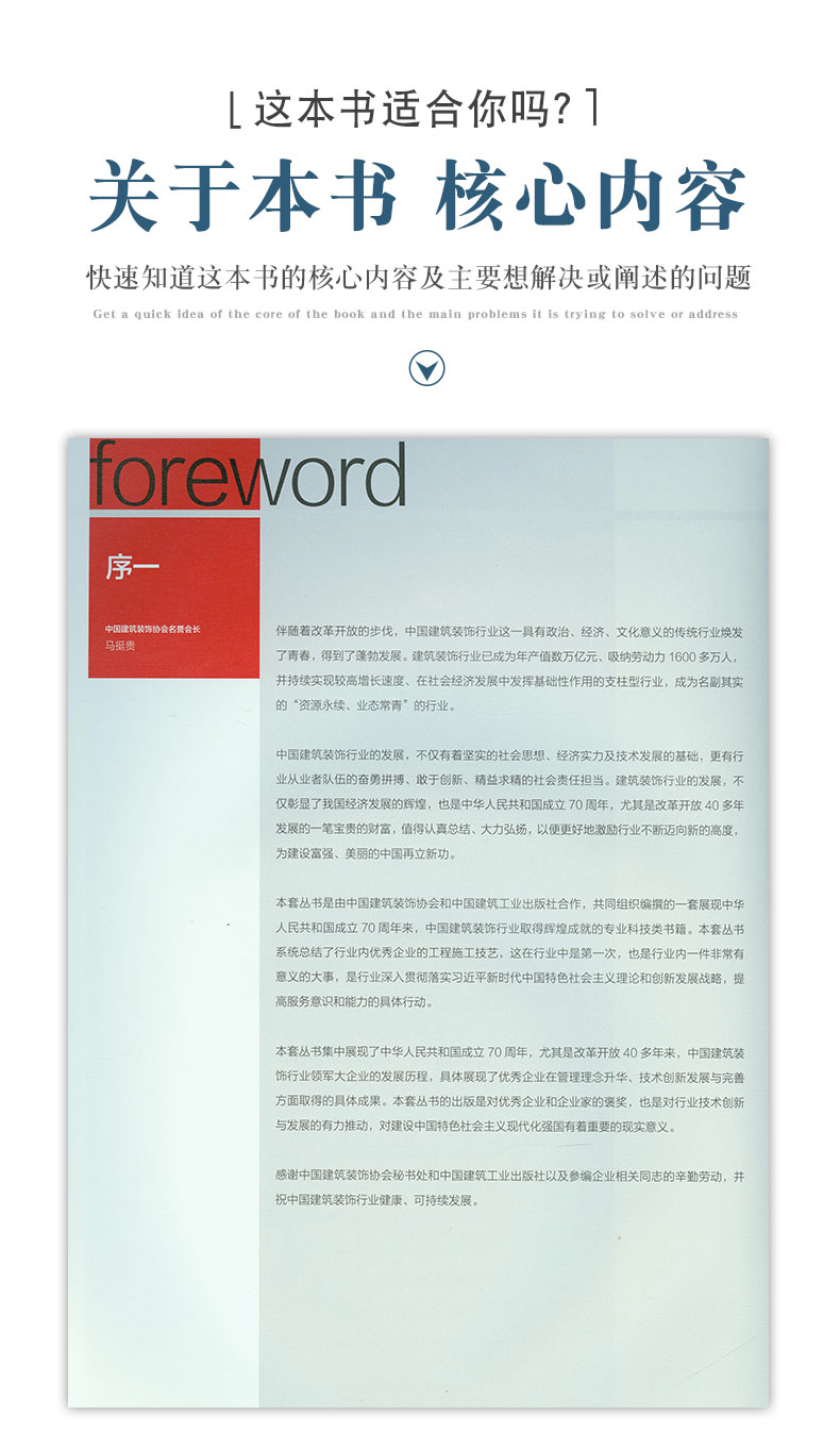 《中国装饰装修精品案例集》是由中国建筑装饰协会牵头组织,由协会各会员单位组织编写的一套丛书,丛书内容主要呈现各会员单位近年来承担的装饰装修精品项目。包括企业简介和案例分析两部分。本书图文并茂,以图片为主,全彩色印刷。
