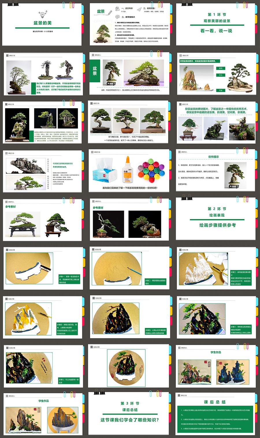 欣赏盆景的素材图片,了解盆景之一中国传统优秀艺术,感受盆景中蕴藏的造型美、肌理美、空间美、意境美,开阔艺术视野,增强艺术审美,提高自己的艺术综合素养。