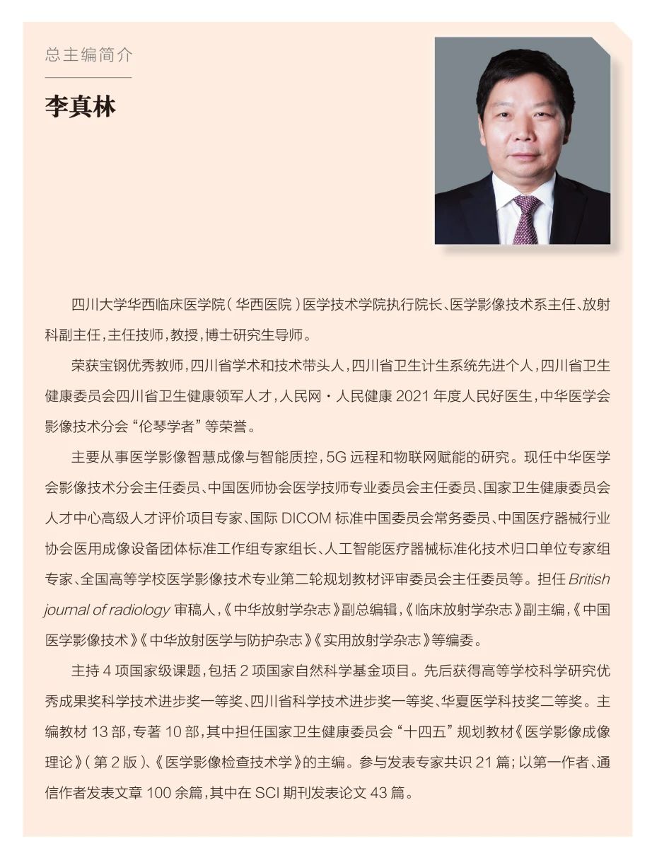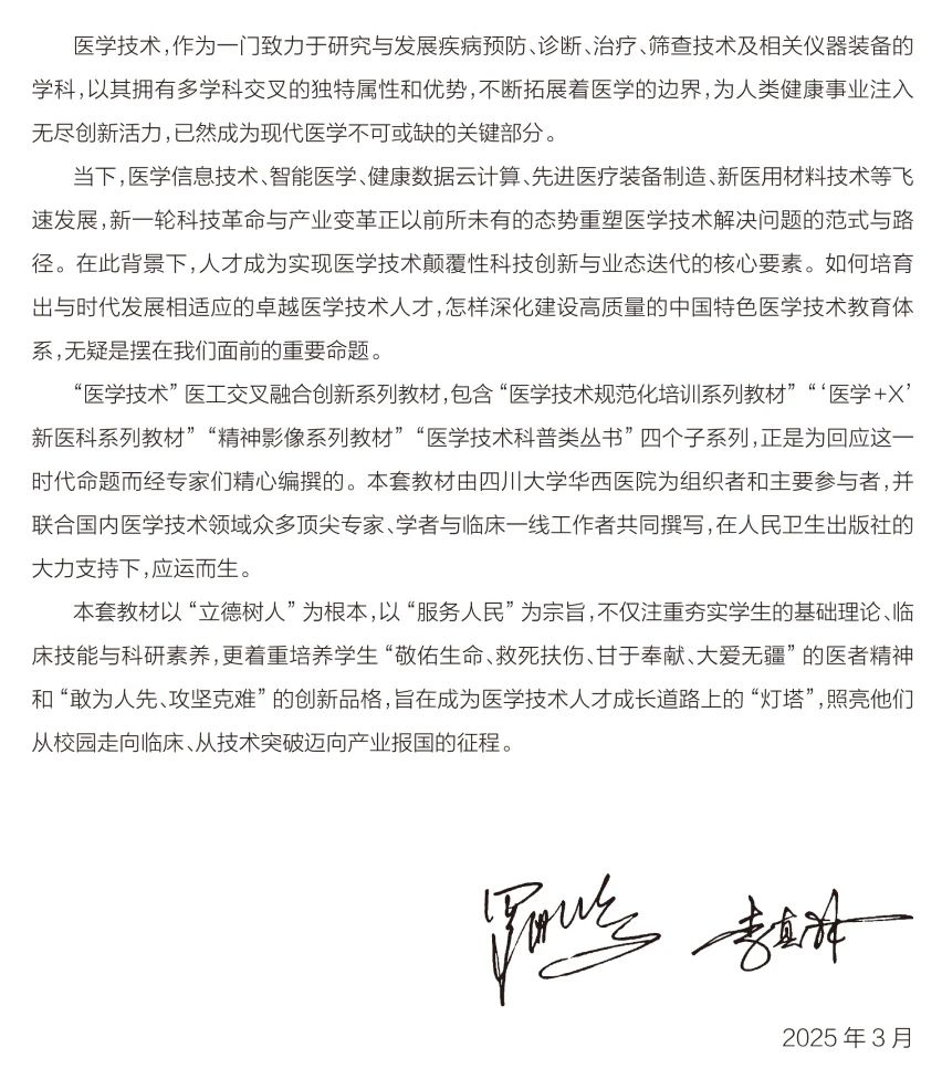 “医学技术”医工交叉融合创新系列教材,包含“医学技术规范化培训系列教材”“‘医学+X’新医科系列教材”“精神影像系列教材”“医学技术科普类丛书”四个子系列。本套系教材由罗凤鸣、李真林两位临床教育教学经验丰富的专家担任总主编,由四川大学华西医院为组织者和主要参与者,并联合国内医学技术领域众多顶尖专家、学者与临床一线工作者共同撰写。