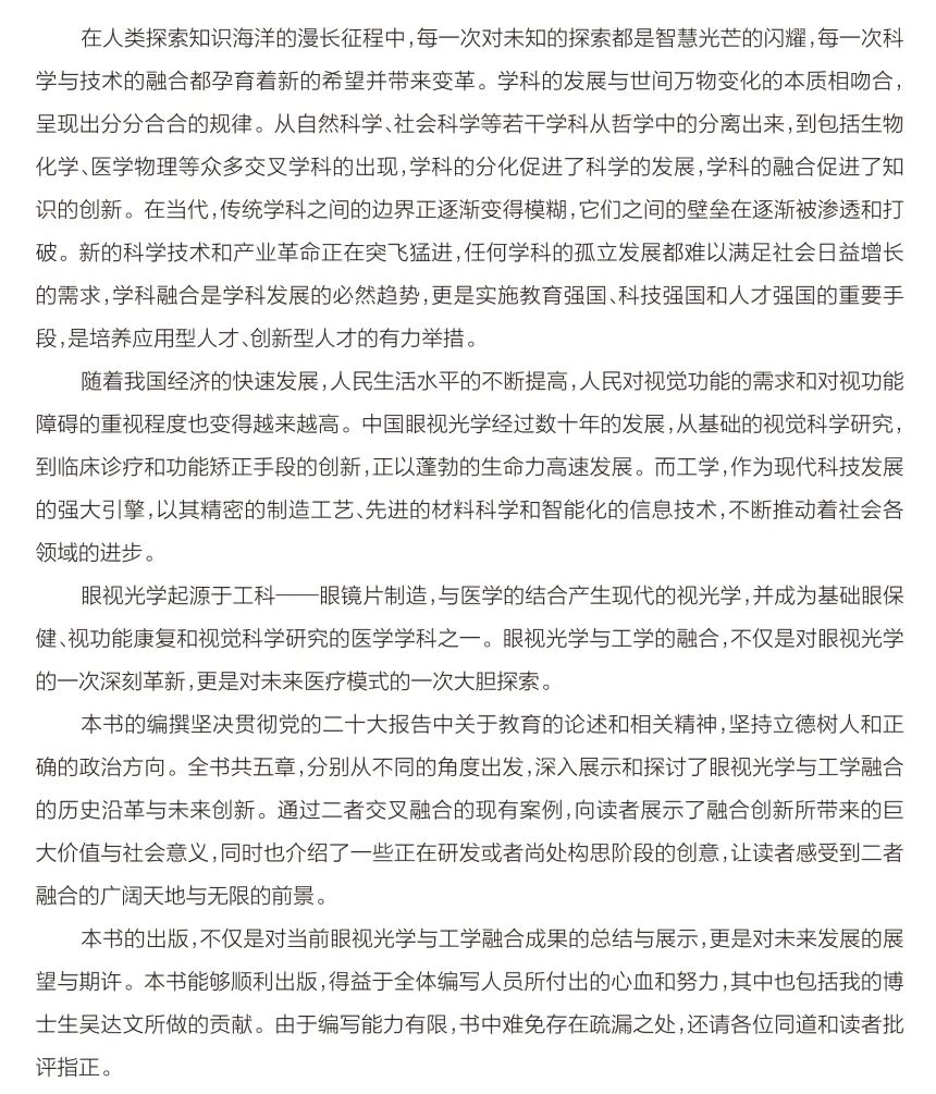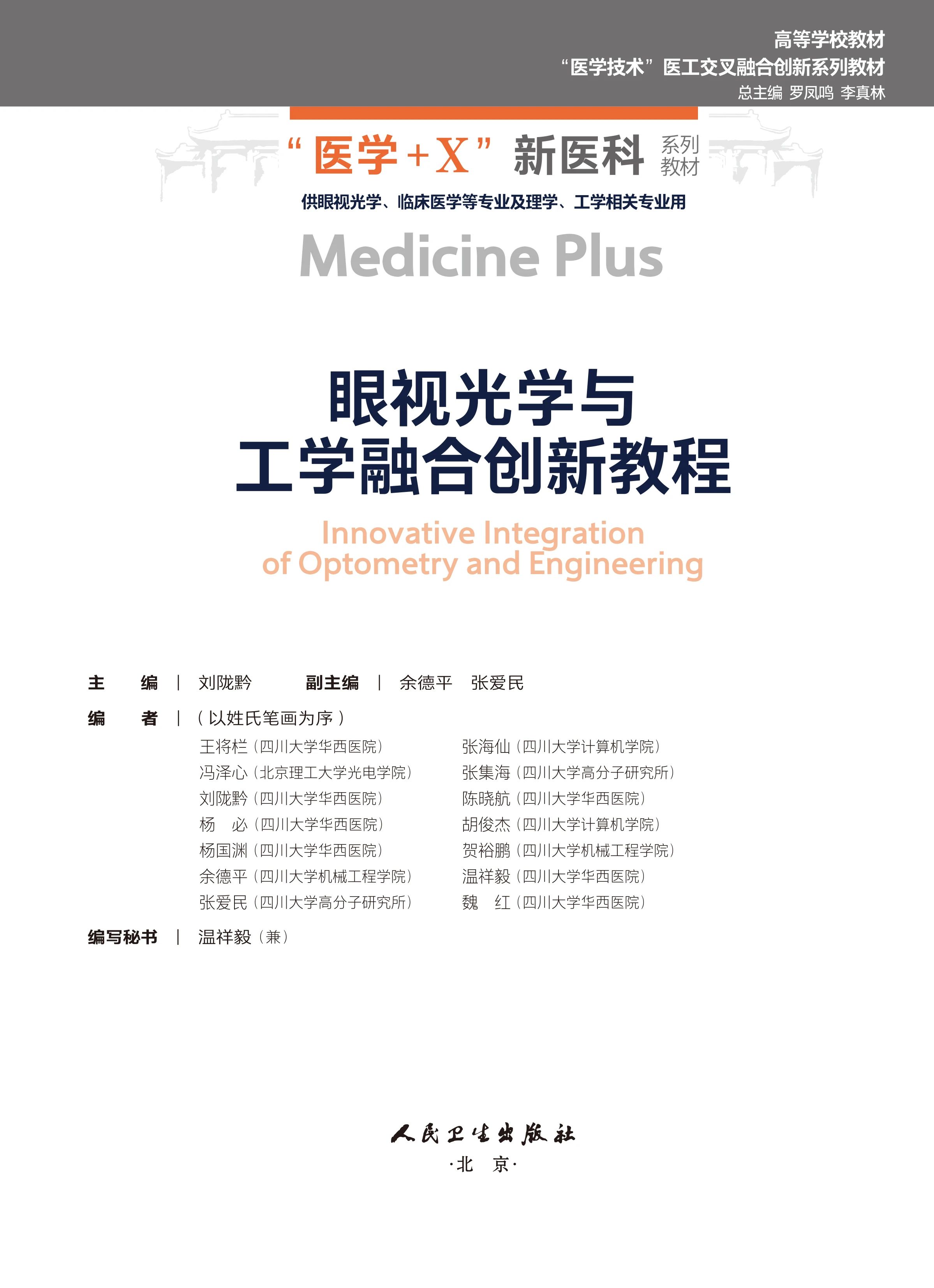 《眼视光学与工学融合创新教程》作为“‘医学+X’新医科系列教材”子系列中的一本,由四川大学华西临床医学院(华西医院)医学技术学院副院长兼眼视光学系主任刘陇黔担任主编。本书共五章,分别从眼视光学与光学、眼视光学与材料、眼视光学与机械制造等角度出发,深入展示和探讨了眼视光学与工学融合的历史沿革与未来创新。通过眼视光学与工学交叉融合的现有案例,向读者展示了融合创新所带来的巨大价值与社会意义,同时也介绍了一些正在研发或者尚处构思阶段的创意,让读者感受到二者融合的广阔天地与无限的前景。