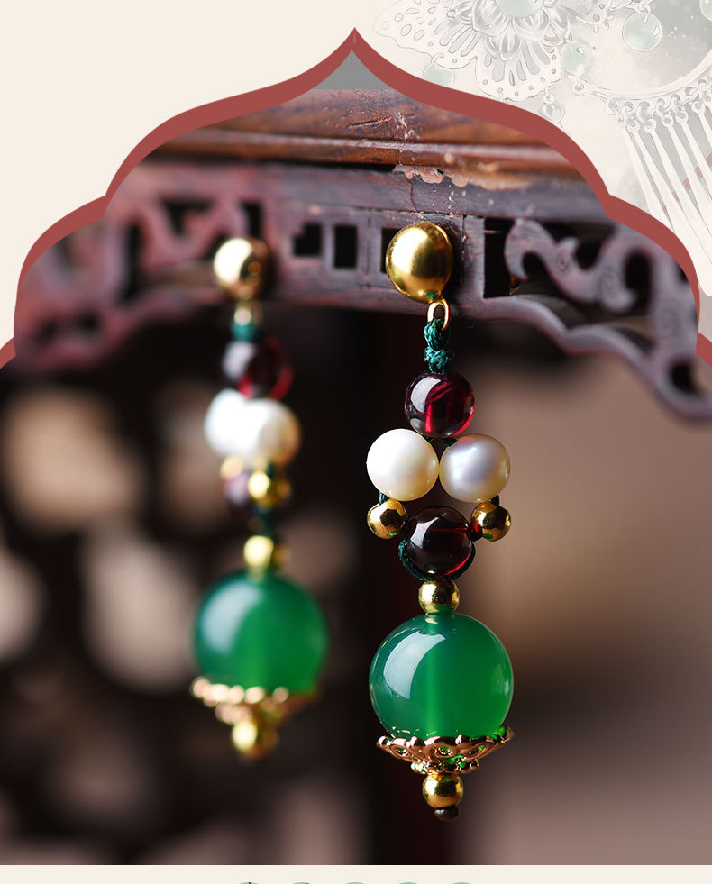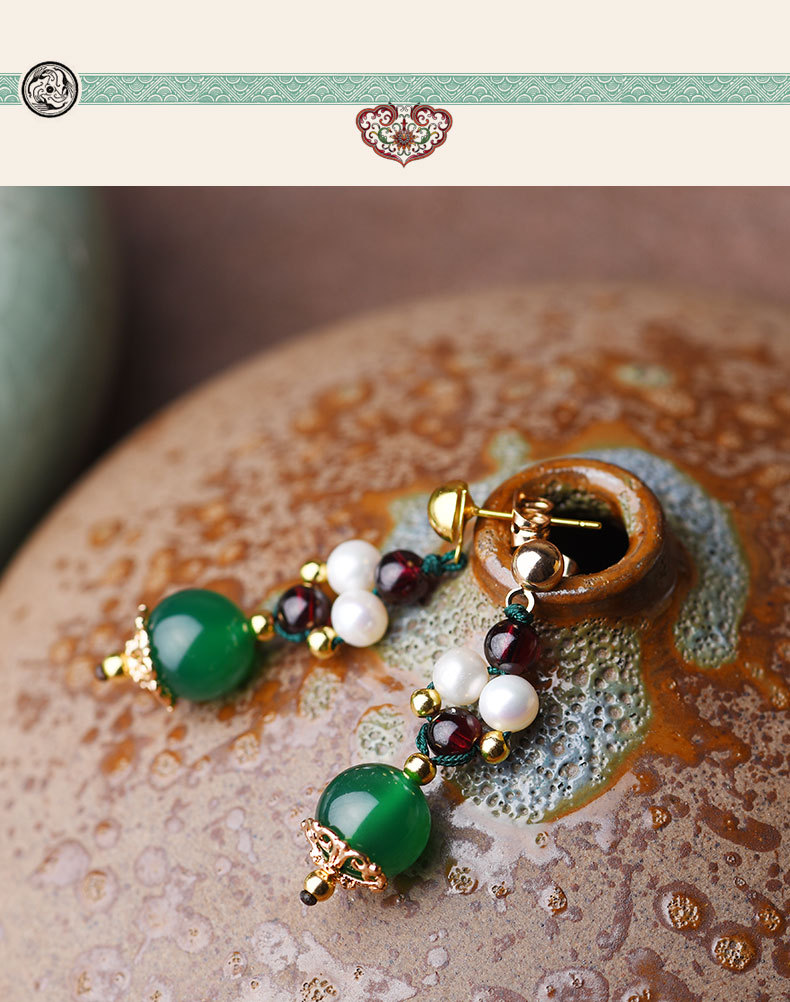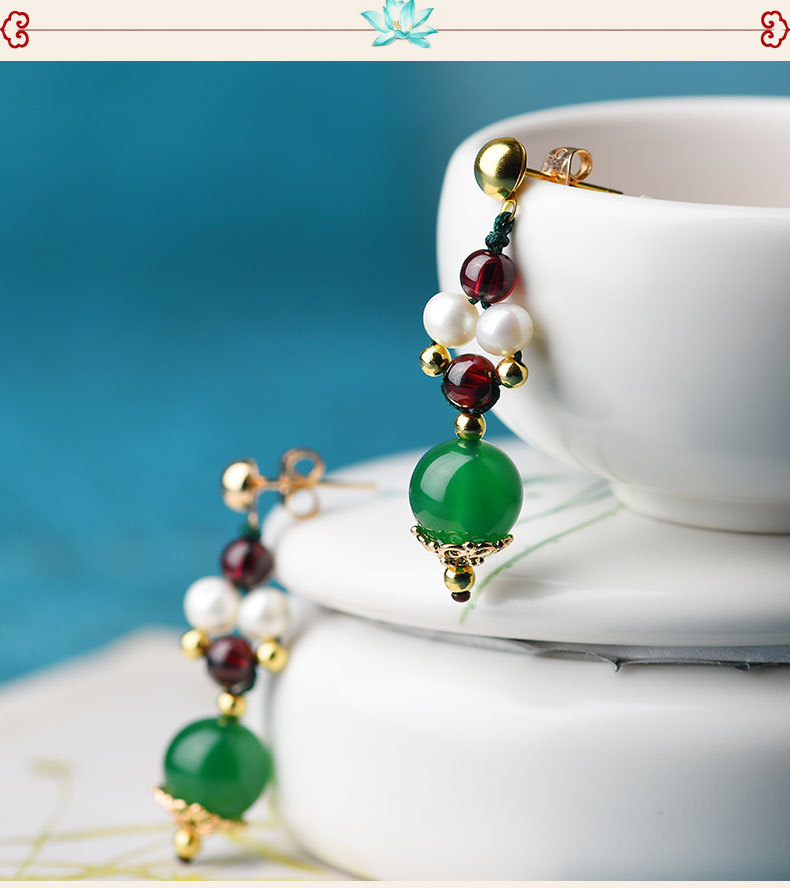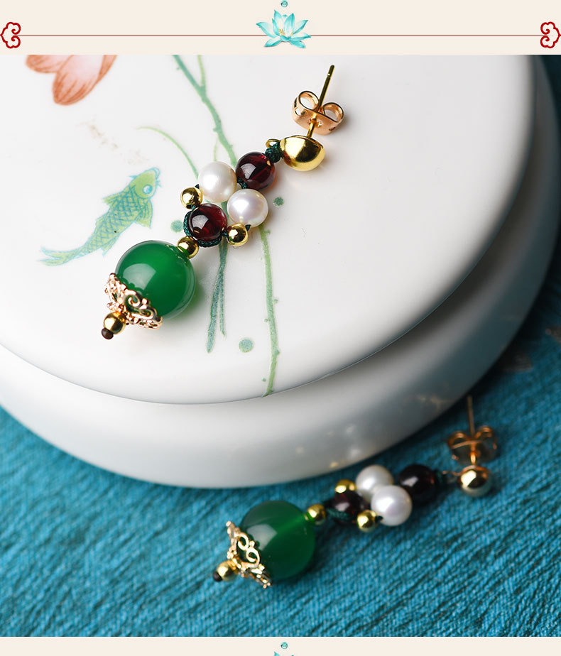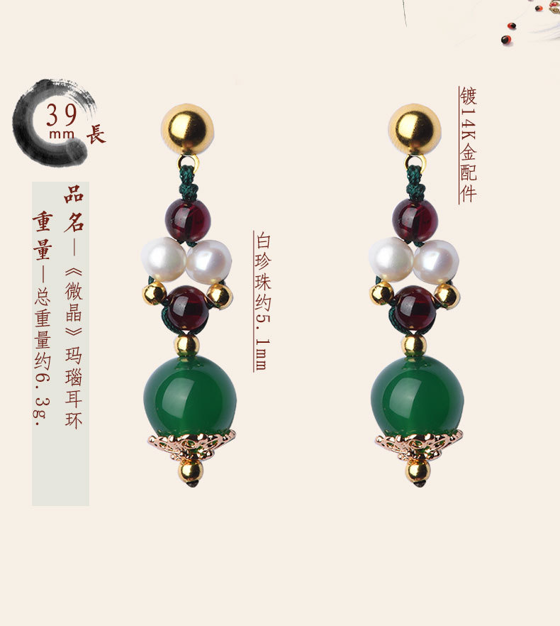 GS-03220177原创绿玛瑙红绿撞色简约个性珍珠镀14k金耳钉 TZW