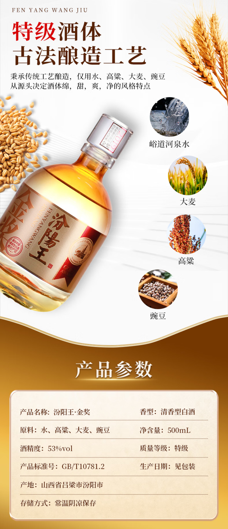 【现货已到】特级酒体 汾阳王 金奖 清香型 53度 500ml*6瓶 整箱